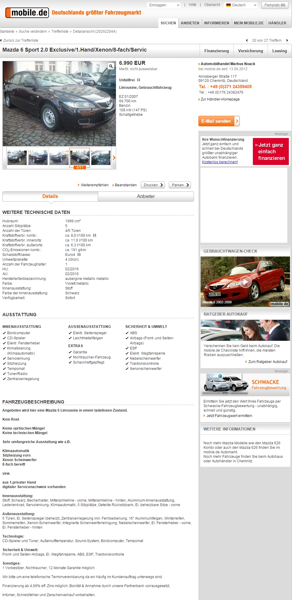 Mazda6 2.0 Pb, 2007, (mobile.de: 202922044), 29.000 zł, Chemnitz (D).