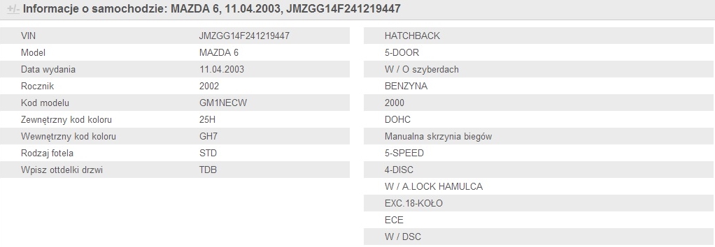 ...a jak ten VIN ma się do tej mazdy? Bylby ktos na tyle uprzejmy sprawdzic? Dzwonilem do sprzedajacego i taki tez mi VIN podał. Mi wyskakuja rozne dziwne rzeczy podstawowe jak : 2500cc, gasoiline ;p, 2005 ! ...