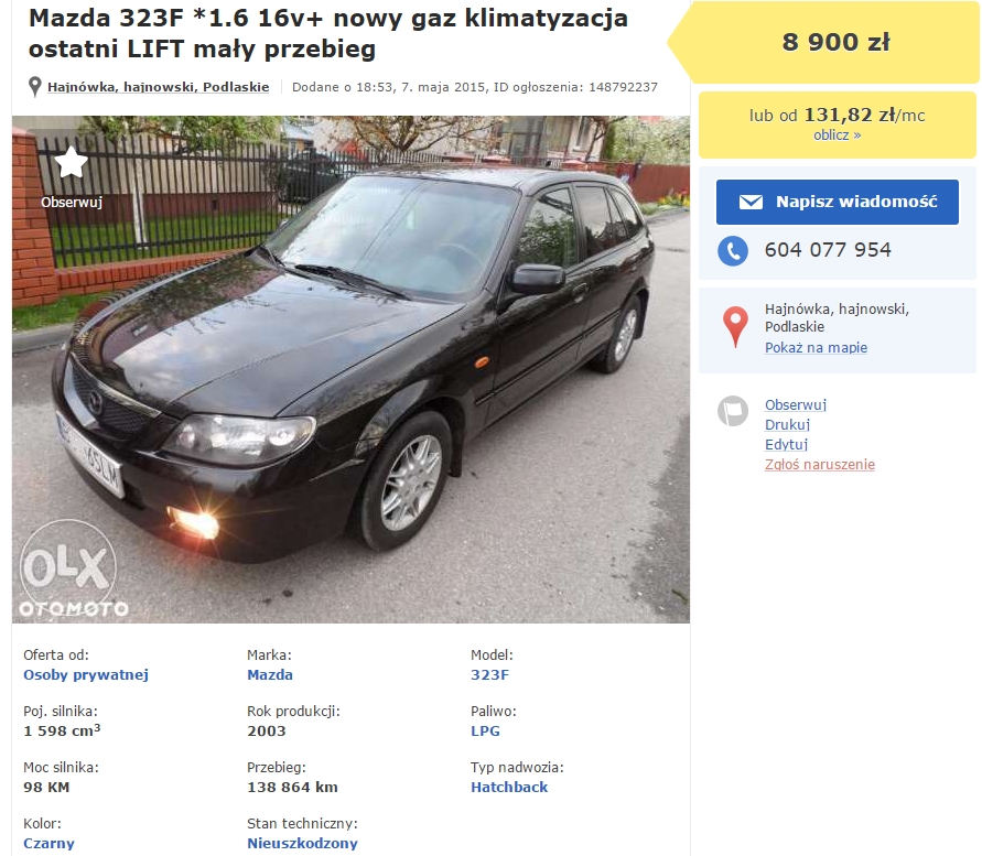 Mazda 323 1.6 Pb/LPG, 2003, (olx: 148792237), 8.900 zł, Hajnówka.