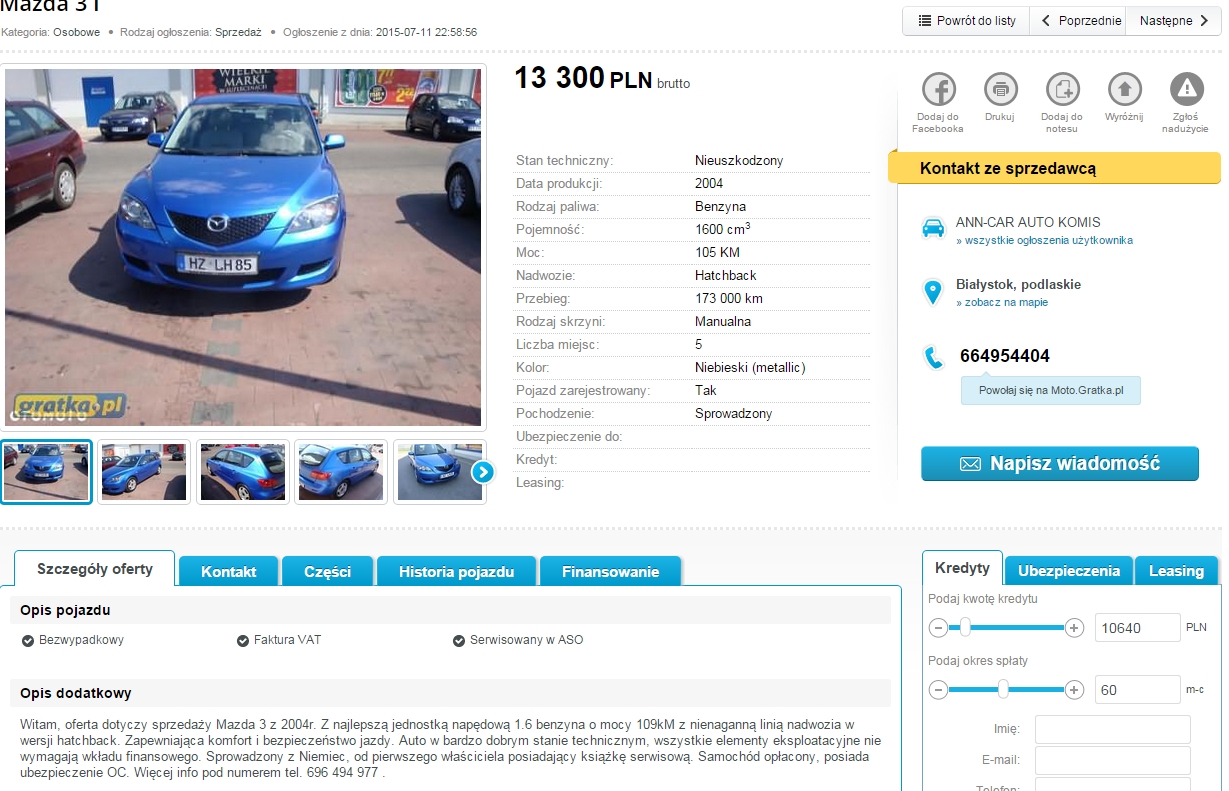 Mazda3 1.6 Pb, 2004, (motogratka: 18864903), 13.300 zł, Białystok.