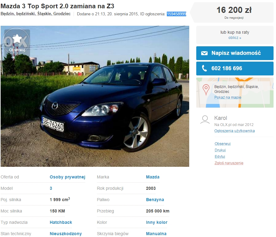 Mazda3 2.0 Pb, 2003, (olx,159458999 ), 16.200 zł, Będzin.