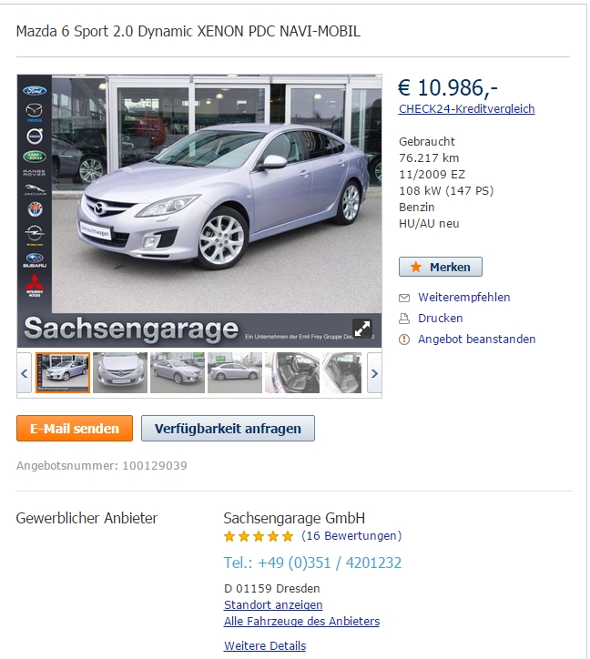 Mazda6 2.0 Pb, (autoscout24: 267895582), 46.231 zł, Drezno (DE).