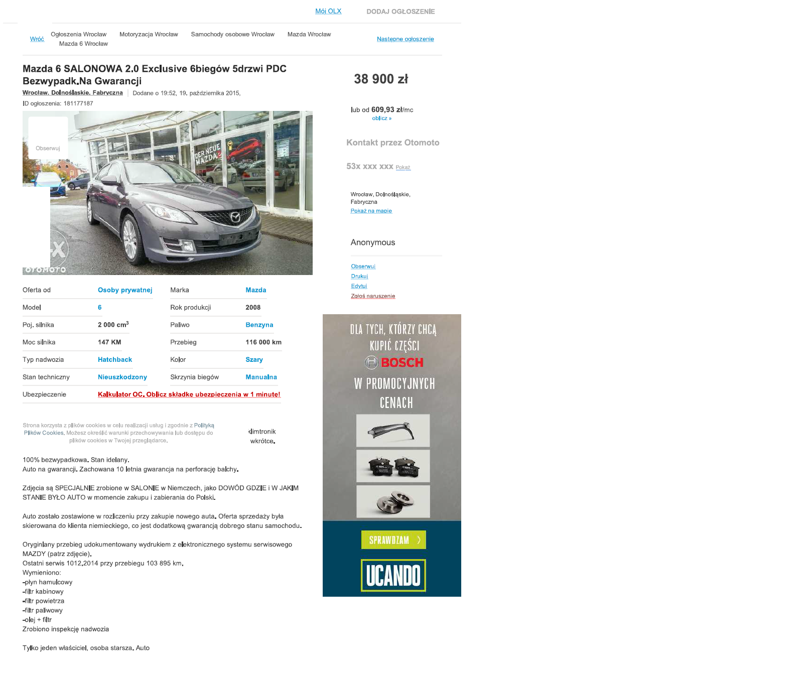 Mazda6 2.0 Pb, 2008, (olx: 181177187), 38.900 zł, Wrocław.