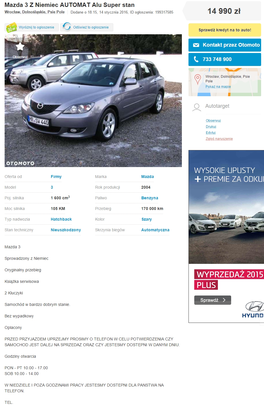 Mazda3 1.6 Pb, 2004, (olx: 199317585), 14.990 zł, Wrocław.
