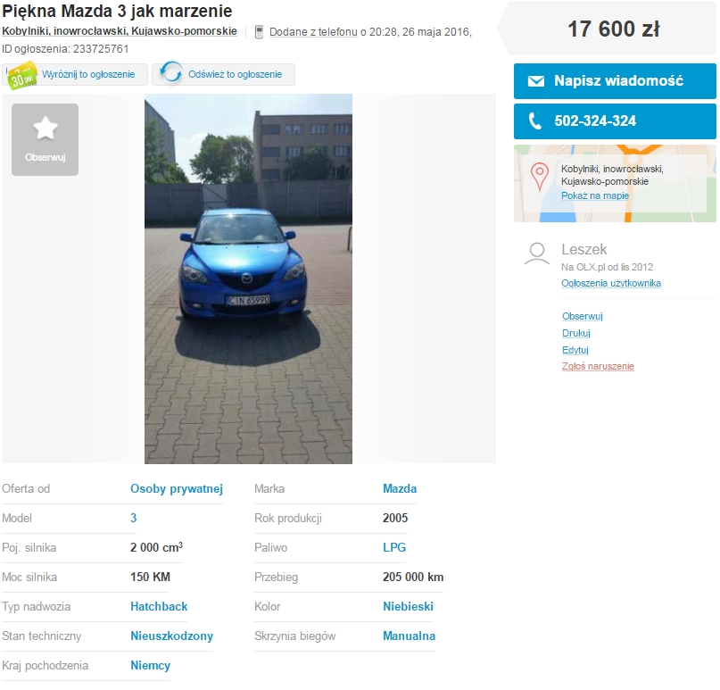 Ze zdjec nie ma sie za bardzo do czego przyczepic. Natomiast po mojemu to jest wiele pytan do zadania sprzedajacemu. Gdzie nabyl to auto 2 lata temu i czy ma historie jej serwisowania przez te 11 lat? Nie chodzi tylko o serwis Mazdy ale tez wolne warsztaty. Co z rdza? Czy sprawdzal kompresje silnika przy zakupie? Ciekawe co mial na mysli piszac ze czeka na nowa trojke czy chodzilo o rocznik dajmy na to 2006 czy moze 2016. Pol roku temu zalozone LPG i sprzedaje podejrzane. Uzyskaj odpowiedzi to wtedy bedzie mozna myslec dalej.