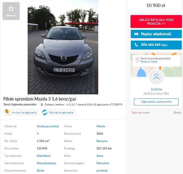 Mazda3 1.6 Pb, 2004, (olx: 472780975), 10.900 zł, Toruń.