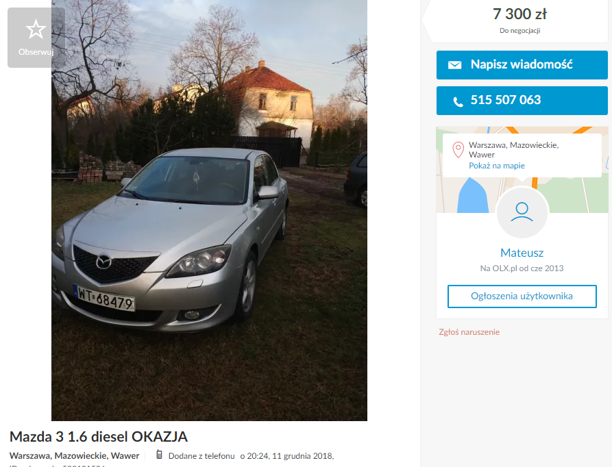 Mazda3 1.6 ON, 2004, (olx: 500101526), 7.300 zł, Warszawa.