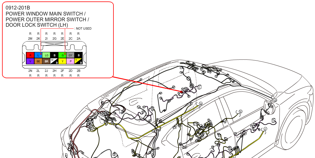 Więc jeśli wiązki "rear harness" są ze sobą zgodne kolorami (a więc i pewnie nazwijmy to "elektrycznie" również), to co jest w drzwiach nie ma już znaczenia. Jedyny warunek do spełnienia to kompletne drzwi z wszystkimi przełącznikami, silniczkami i lusterkiem (głośnik można odpuścić, ale pewnie też będzie w kompletnych drzwiach). Bo jak widać po poniższym przykładzie mając wiązkę USA to ciężko będzie tam wsadzić cokolwiek z EU – wewnętrzne rozprowadzenia są zwyczajnie inne.