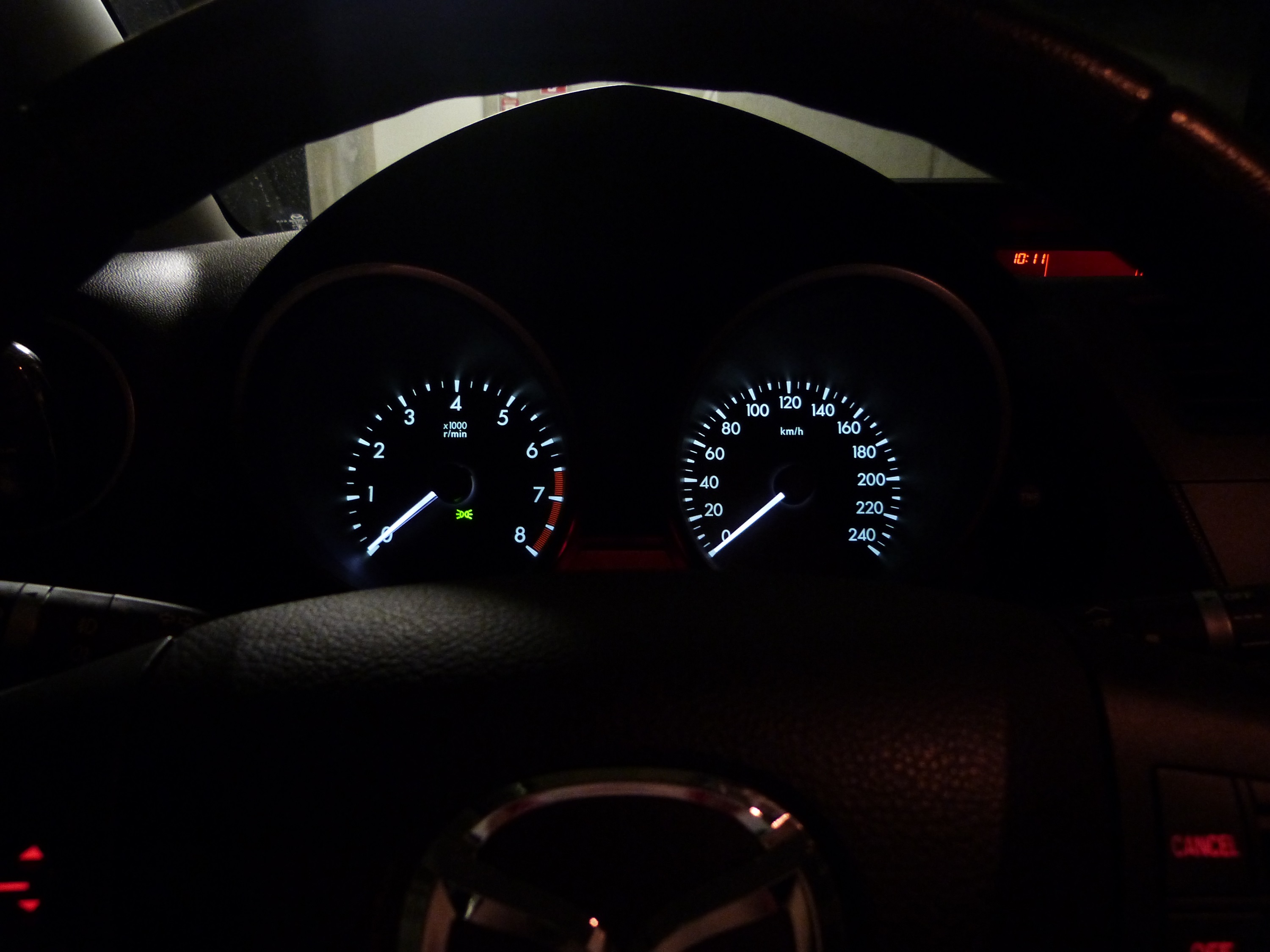 (tak jak w CX-5 etc... – brrrrr) i nie moglem juz patrzyc na to polaczenie (nie urazajac nikogo – subiekcja po prostu) postanowilem zaingerowac we wskazowki...Poniewaz w rodzinie na wyciagniecie dloni mam RX-a 8 i tam zegary maja moja ulubiona konfiguracje kolorow (same w sobie wskazowki sa czerwone) analogia zmian byla oczywista – w CW wskazowka jest transparentna i jest doswietlana diodami jesli moge tak to ujac...W praktyce wyglada to tak, ze w dzien po zmianie slabo widac podswietlenie na czerwono, ale jak sie zaczyna sciemniac lub jak zaliczamy wjazd do garazu itp. , to juz jest jak dla mnie bajka...Kolor w rzeczywistosci jest ciemnoczerwony (cos na wzor aut z grupy VAG-a). Jak zawsze kwestia gustu...Ocencie sami...