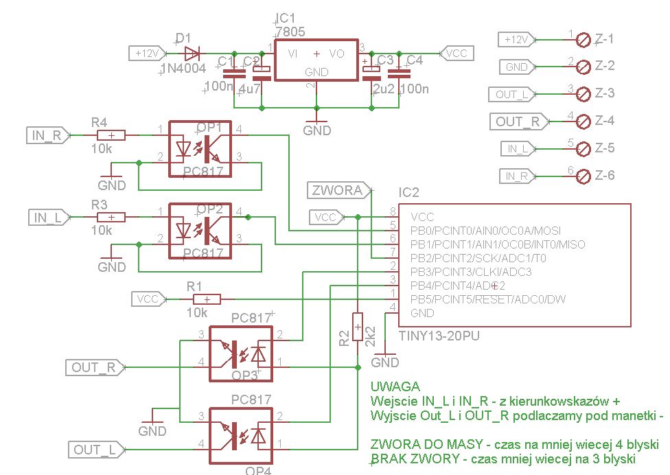 Zamierzałem zrobić taki układ, który nie wymagałby przecięcia oryginalnej wiążki od manetek do BSI, ale niestety nie mogę znaleźć błędu więc żeby utrzymać ten standard zrobiłem układ, który sygnał pobiera z lamp (zlicza impulsy) i odpowiednio steruje masą na wejściu do BSI. Po przetestowaniu podzielę się informacjami – na razie któtkie info bo niby wszystko działa, ale muszę jeszcze poprzerabiać co nieco.