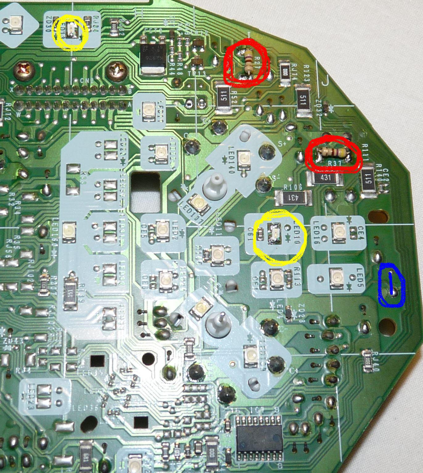 Lutujemy diody świecące (oznaczone na żółto), oporniki 470omów na czerwono i robimy zworę oznaczoną na niebiesko.