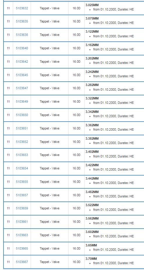 – luz zaworowy reguluje się poprzez wymianę popychaczy szklankowych (na grubsze lub cieńsze w miejscu styku z trzonkiem zaworu). W załączonych wątkach są numery części MAZDA lub FORD. Cena w ASO Mazda około 105 zł / szt. Cena w ASO Ford około 55 zł / szt. Potwierdzam, że pasują od Forda i takie też użyłem. Przy zamówieniu bazowałem na numerach części do FORD Mondeo 2000-2007 (GE) silnik 2.0 Duratec / Zetec https://ford.7zap.com/en/car/99/6.19112 ... /66051/#11