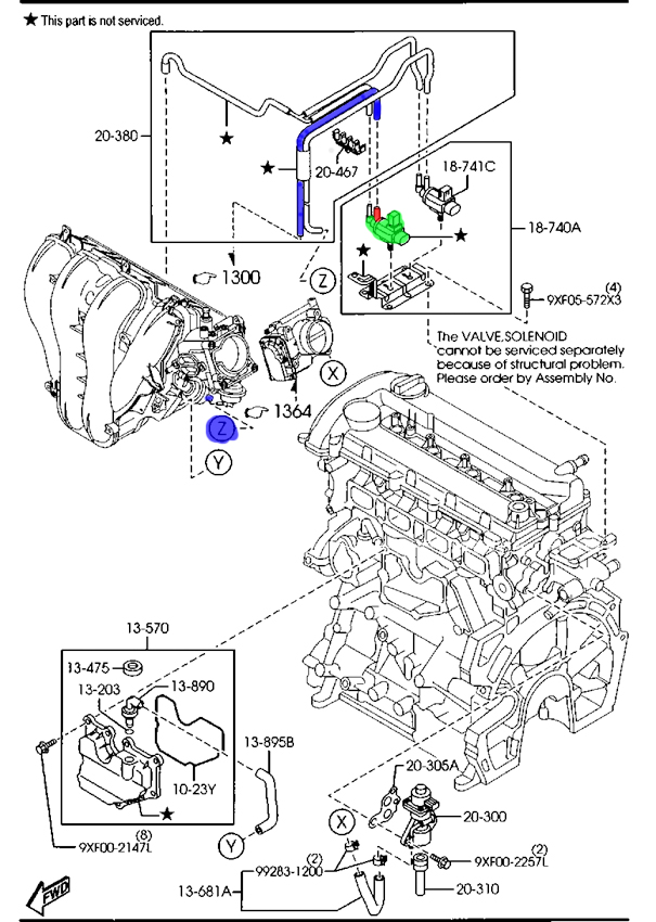 Mechanik odpiął przewód podciśnienia od tego zaworu i zaślepił ([color=#000080]niebieski przewód[/color]), dodatkowo zaślepiliśmy wyjście (czerwone) z SOLENOID (zielony na schemacie). Co powoduje że klapki w kolektorze dolotowym są na stałe otwarte. Wyjechałem z warsztatu i ..... Mazda odżyła i zasuwa jak należy. Na razie przez weekend pojeżdżę z zaślepionymi elementami i zobaczę co się będzie działo.
