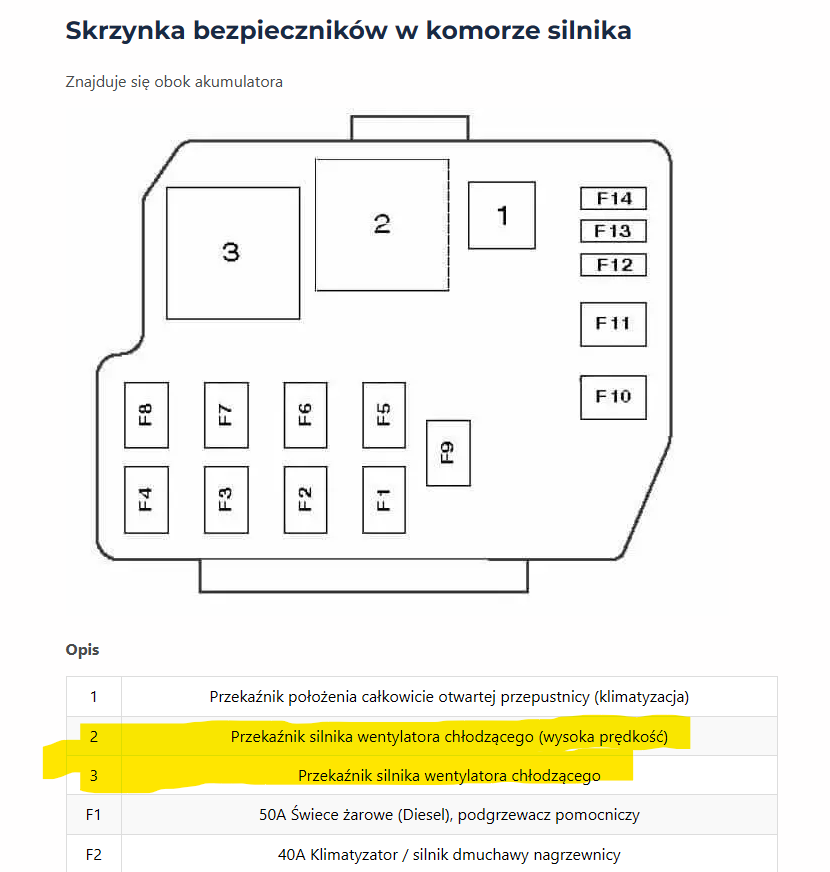 Przekaźnik jest sprawny ten pierwszy po lewej na górze w skrzynce w komorze silnika – na pewno odpowiada za łączenie wentylatora jak włączę klimatyzację.