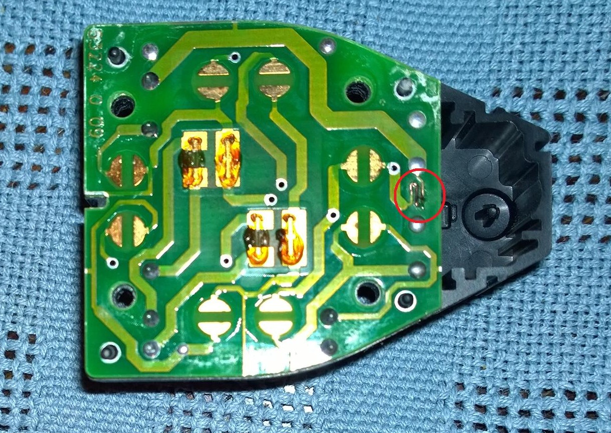 Zaznaczone miejsce uszkodzonej ścieżki. Połączyłem cyną.