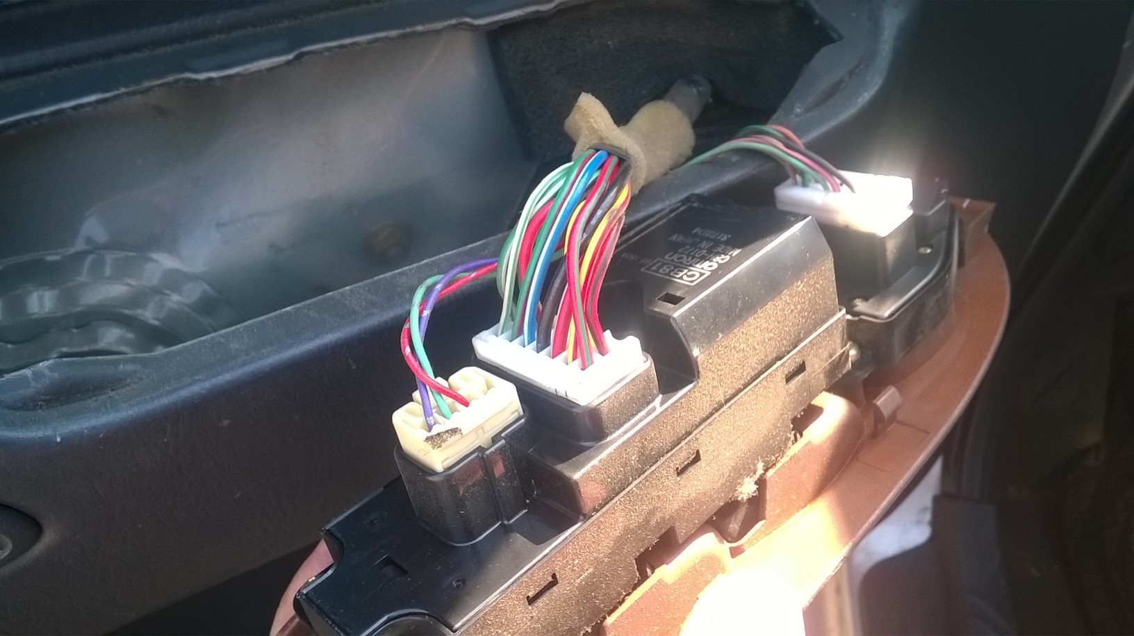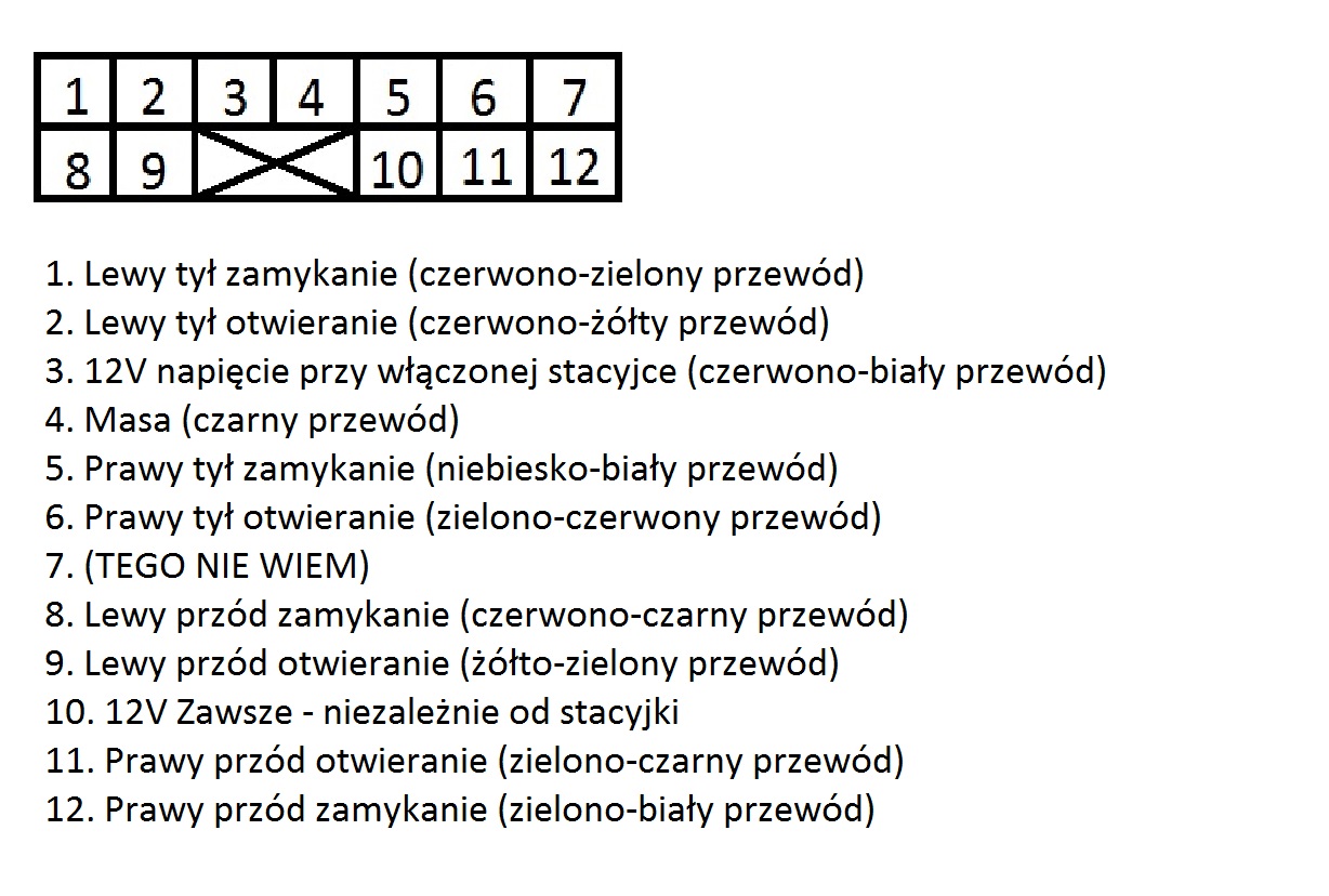 Jakiś czas temu wpadł mi do głowy pomysł aby zrobić sobie moduł automatycznego domykania szyb do mojej Madzi oparty o Arduino. Jako że z zawodu jestem programistą to z softem nie będzie problemu, obawiam się jedynie elektroniki gdyż w tym nie jestem specjalistą. Nie mniej jednak zabrałem się powoli za pracę nad projektem i pierwsze co zrobiłem to wzorując się artykułem: http://www.mazdaspeed.pl/forum/viewtopic.php?f=409&t=163796 zabrałem się za złącze przy przyciskach w aucie – wziąłem multimetr i trzymając jeden przewód na masie przykładałem drugi kolejno do styków zamykając i otwierając przyciskami szyby posprawdzałem który przewód za co odpowiada a rezultat swoich pomiarów zamieściłem na poniższym obrazku: . Po przetestowaniu uznałem że warto sprawdzić czy faktycznie jak podłącze 12V pod pin 1 to prawy tył zacznie mi się zamykać, ale niespodziewanie coś zaiskrzyło i się nieco przyfajczyło