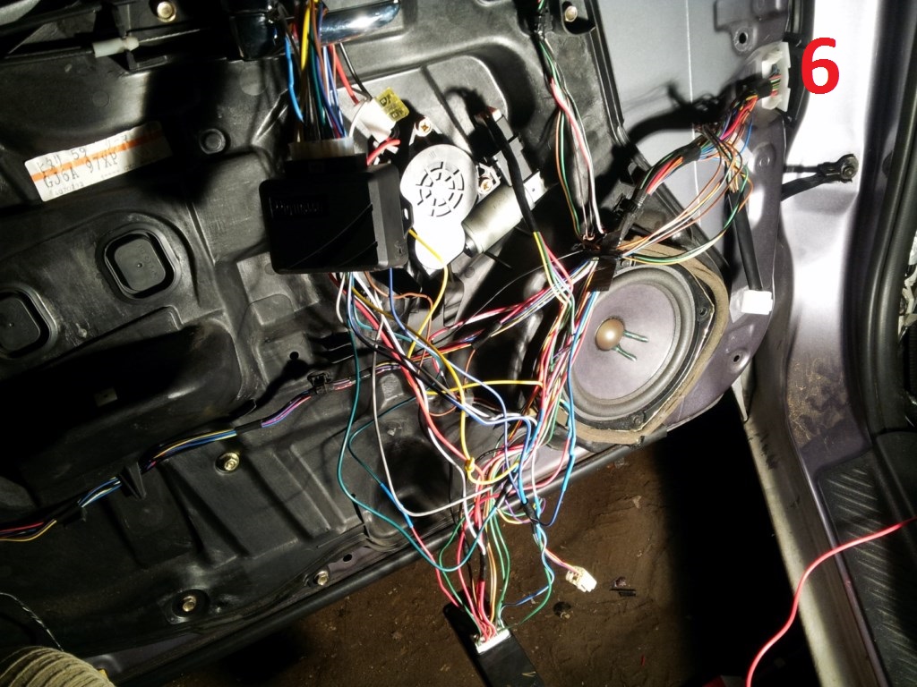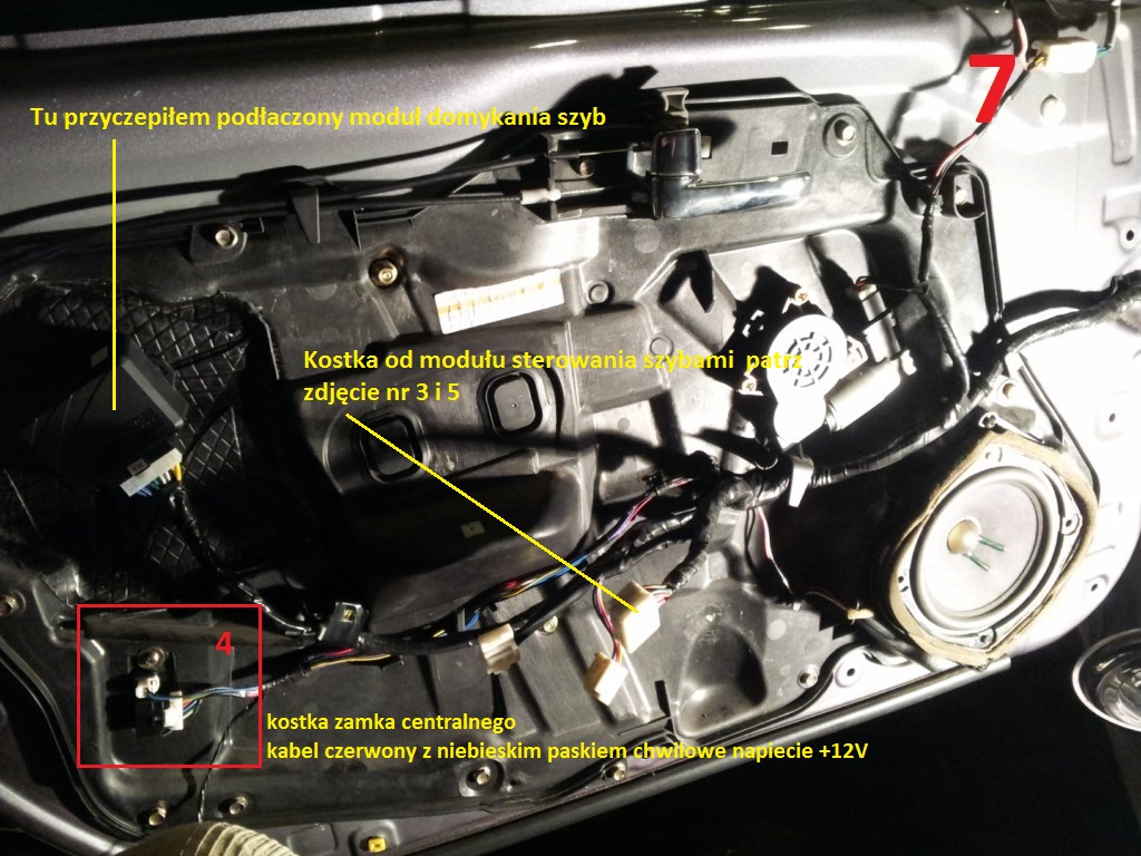 Całe podłączenie dokonamy w drzwiach kierowcy bo tam znajdują się wszystkie nam potrzebne kable , z ciągamy tapicerkę drzwi i musimy się dobrać do kostek ze zdjęć nr (3/5 ta sama kostka zdj,z dwóch stron)od modułu sterowania szybami i nr 4 od zamka centralnego drzwi , lokalizacja tych kostek jest na zdjęciu nr 7.