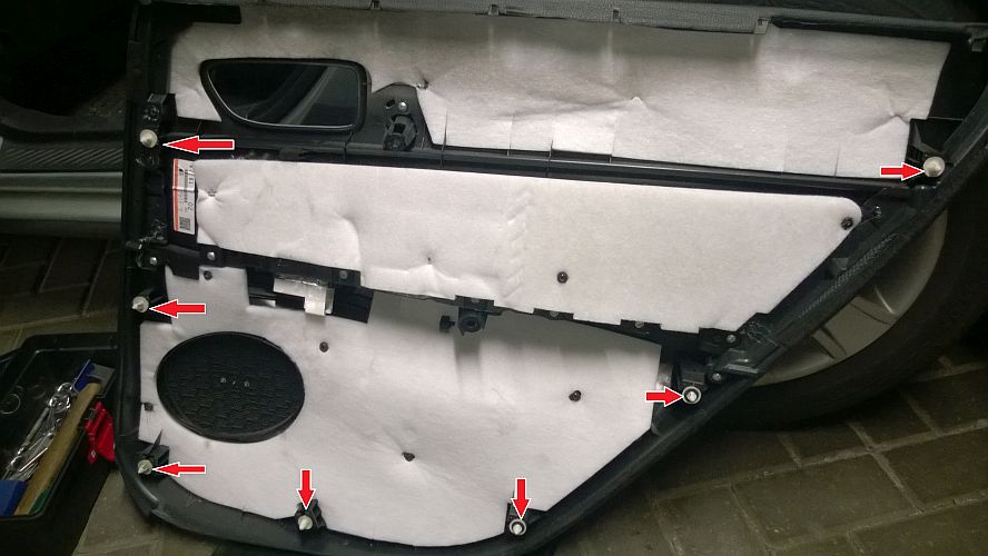 Za pomocą małej łapki, od spodu drzwi, delikatnie żeby nie uszkodzić plastikowych elementów oraz lakieru, podwadzamy tapicerkę do momentu puszczenia spinki. Po pierwszej spince kolejne można odczepiać korzystając już z siły własnych rąk :] Rozmieszczenie spinek widoczne na zdjęciu.