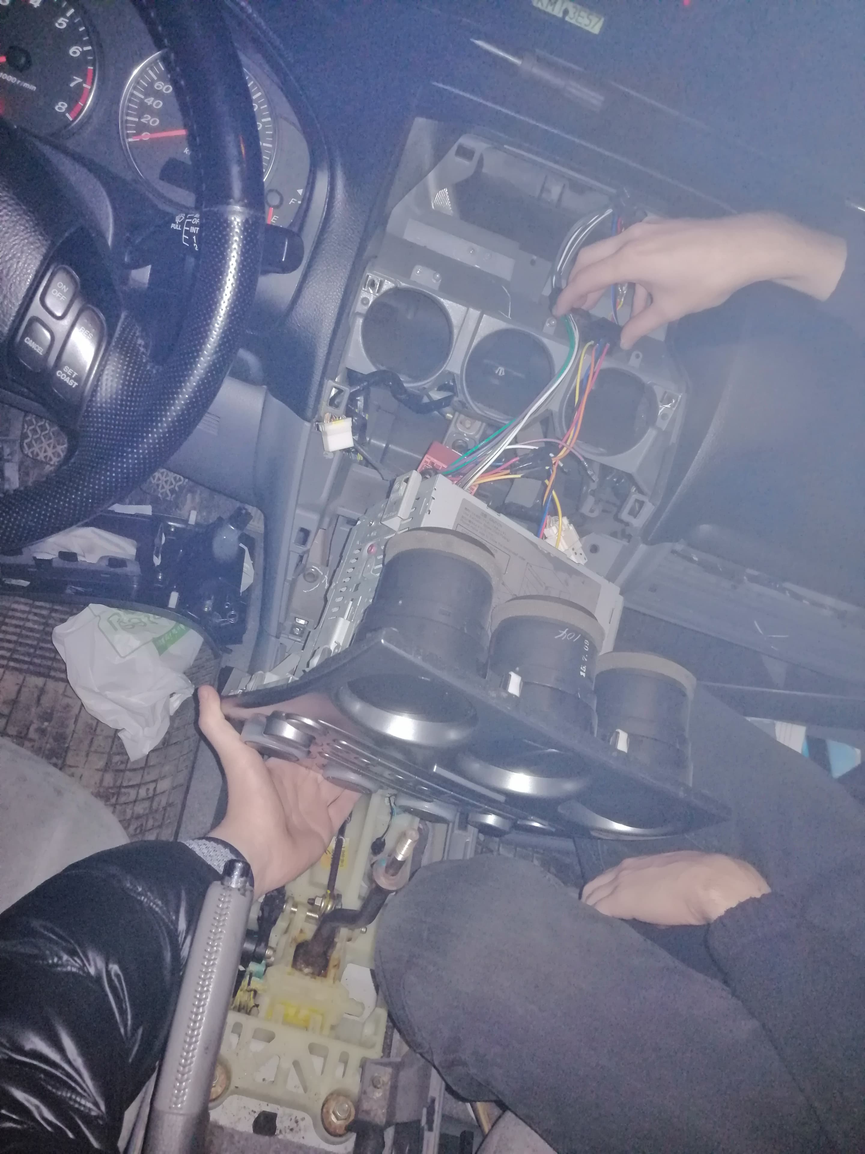 Rozbiórka kokpitu (co po trzeciej tego typu operacji robi się w ciągu 3min) następnie składanie kabli, ot tu pojawia się problem funkcjonowania ekranu klimatyzacji oraz komputera pokładowego, w moim przypadku te dwie funkcje chciałem uratować. Więc od kablologii zaczynając, pozyskałem wtyk oem i jakieś 7cm kabla z przejściówki iso->mazda, odciąłem kable od głośników i przylutowałem ją na sekcji zasilania przejściówki mazda –> iso tym sposobem mając wtyki iso oraz wtyk mazdy bez ingerencji we wtyk który był już w samochodzie. Całość opierała się na trzech przejściówkach, mazda->iso->mini iso. W radiu fabrycznym zostawiłem JEDYNIE część zasilającą radio, głośnikową obciąłem i zaizolowałem.