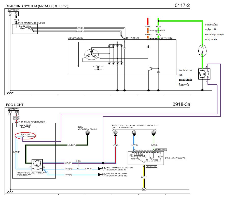 Ja nie miałem przeciwmgielnych więc postanowiłem umieścić tam żarówki 21W i uczynić z nich światła do jazdy dziennej. Zazwyczaj światła do jazdy dziennej zapalają sie po przekręceniu kluczyka i gasną po zapaleniu mijania lub drogowych. Ja opóźniłem moment zapalania aby nie obciążać akumulatora podczas rozruchu i dlatego sterowanie podłączyłem do alternatora. Światła do jazdy dziennej zapalają się dopiero gdy alternator zacznie ładować. Stąd te kombinacje. Chyba jasno to opisałem.