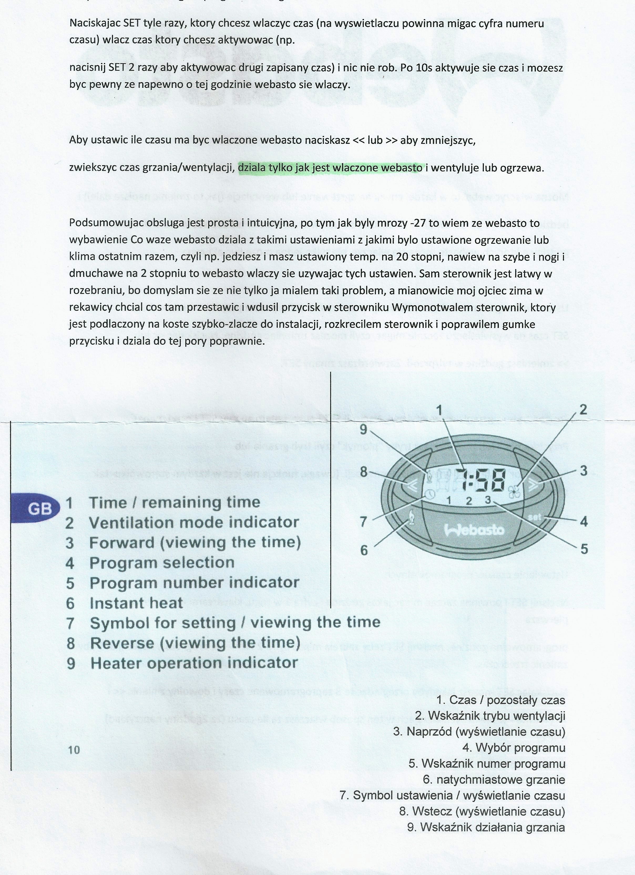 Mandey dziękuje Ci za szczegółową instrukcję. Próbowałem to ustawić i nie mogę chyba mam coś zepsute że nie załącza się o danej godz. bo w trybie natychmiastowym działa. Mógłbyś mi podpowiedzieć ten czas poz. 7 z instrukcji symbol ustawienia/wyświetlanie czasu co to dokładnie oznacza można ten czas zmienić? Jak np. ustawie żądany czas parę sek. miga i potem zaczyna szybciej migać i wtedy kiedy się wciśnie < lub > to pokazuje się drugi czas z ikonką zegara nie wiem co on oznacza. Jeżeli mam uszkodzone coś ze nie chce się włączyć webasto o danej godz to gdzie zacząć szukać przyczyny? Ostatnie pytanko jak leci delikatny biały dymek spod auta że trzeba się schylić pod auto żeby to zauważyć, nie chmura dymu to oznacza że mogę mieć sztyft(świece) do wymiany czy to jest normalny objaw?