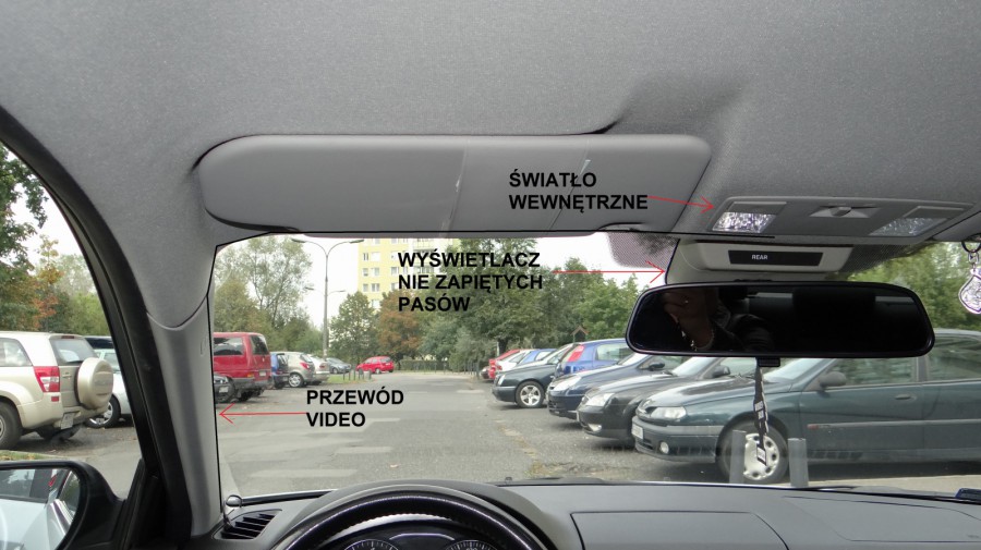 Pod deską rozdzielczą potrzebujesz + ze świateł cofania, masę z karoserii i kawałek kabelka wideo, aby podłączyć urządzenie – odbiornik do ekranu...