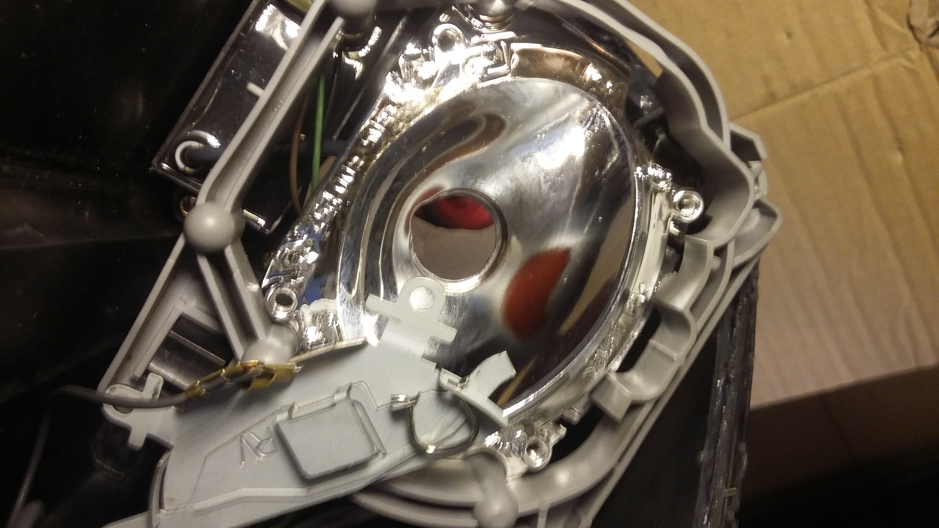 Szkoda że w soczewkach do halogenów odbłyśnik jest przynitowany do stelażu, trzeba całą soczewkę wymieniać albo rozcinać nity i potem kombinować. :(