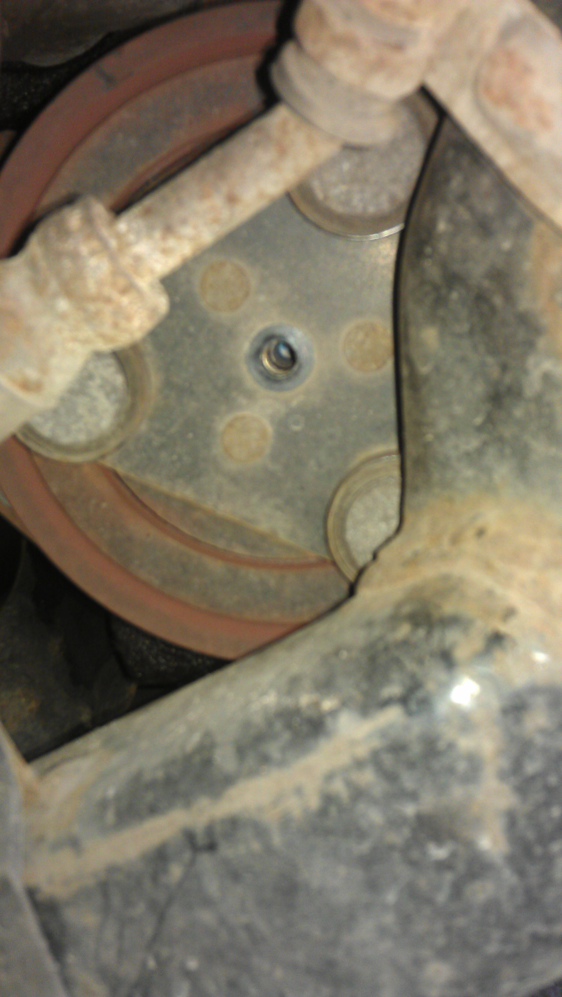 W środku otworu znajdowała się i dalej się znajduje, podkładka, przy czym nie była ona ustawiono osiowo względem otworu tylko tak jakby chciała się wydostać przez tą dziurkę – podkładka o grubości pół milimetra i średnicy hmmm około 8 mm max.