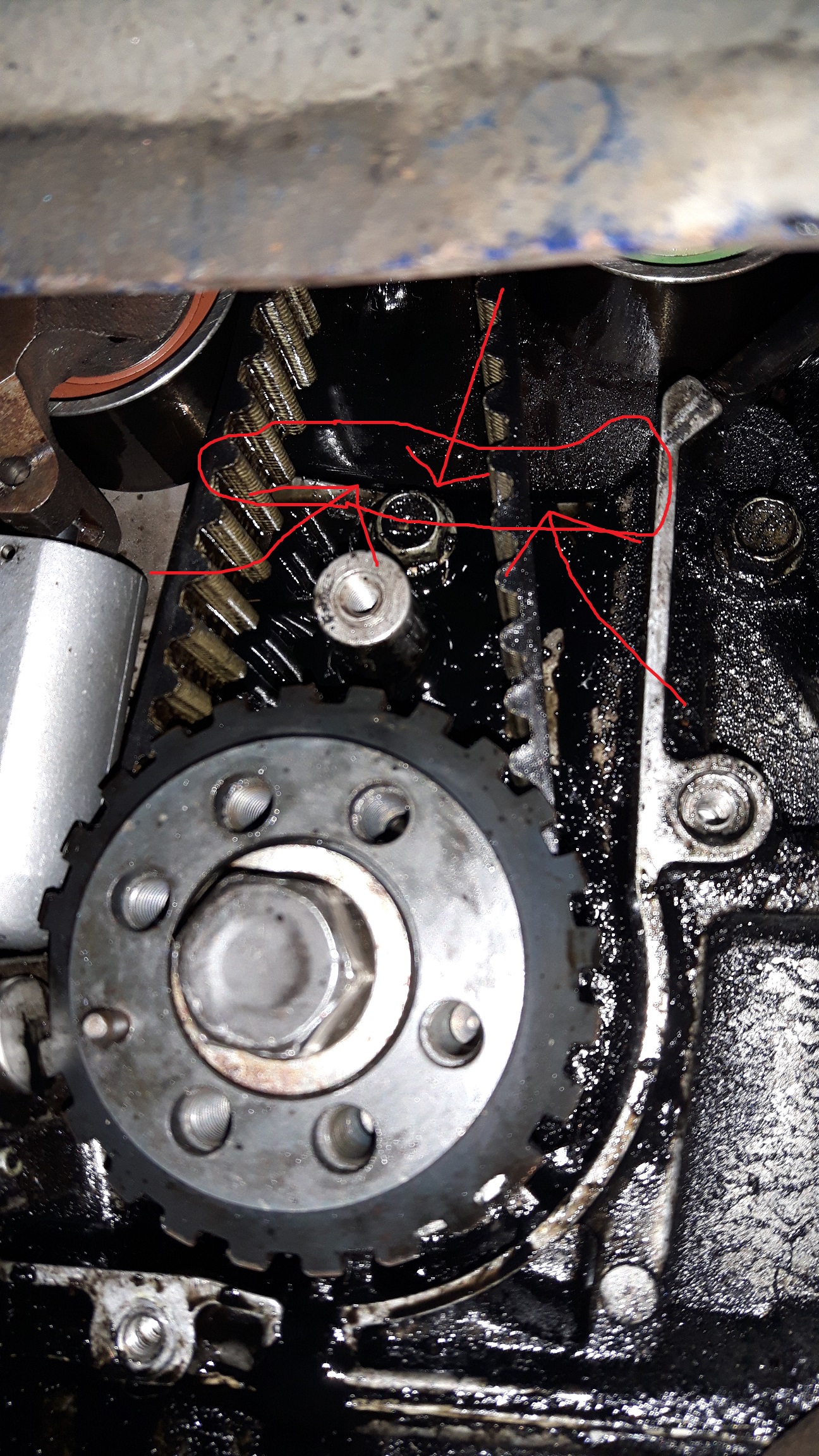 czyżby wyciek spod pompy oleju? jeśli tak to zrzucanie miski, demontaż rozrządu, możliwe że części osprzętu, nie wiem co tam może być dokręcone, ogólnie roboty dość sporo. Nie należy z tym czekać jeśli cieknie szybko z głównej magistrali olejowej, ryzyko zatarcia silnika.