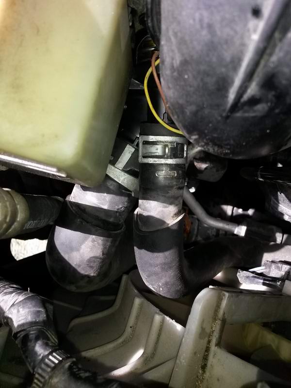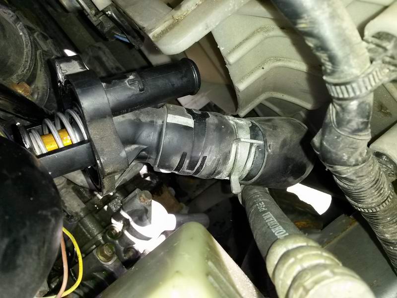 Dzisiaj wymieniłem termostat. Zrobiłem to bez ściągania paska wielorowkowego i odkręcania pompy wspomagania. Da się to spokojnie zrobić tym sposobem i moim zdaniem jest dużo szybciej. Wystarczy mała grzechotka z przedłużkami. Spokojnie odkręciłem termostat, a potem go wysunąłem aby mieć dostęp do metalowych obejm na wężach. Najpierw ściągnąłem mniejszy, potem większy. Od otwarcia maski do zamknięcia 2h bez pośpiechu.