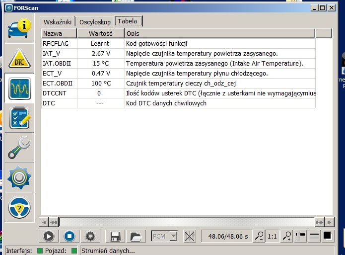 Wygrzebałem mój interfejs diagnostyczny ELM 327, który kiedyś mi się przydał do diagnostyki GFki, pobrałem także z forum MS soft do tegoż interfejsu czyli FORSCAN. I to co udało mi się zbadać to: