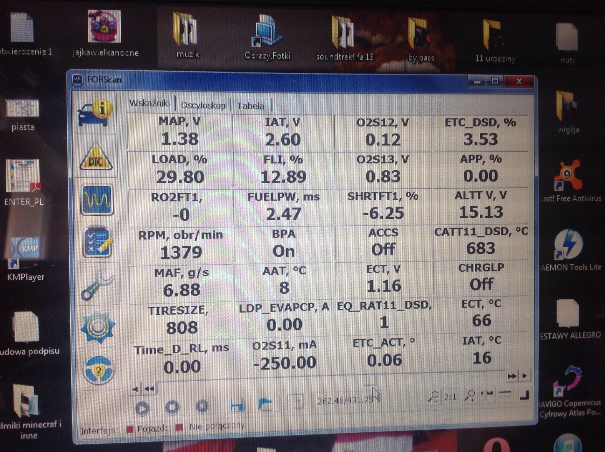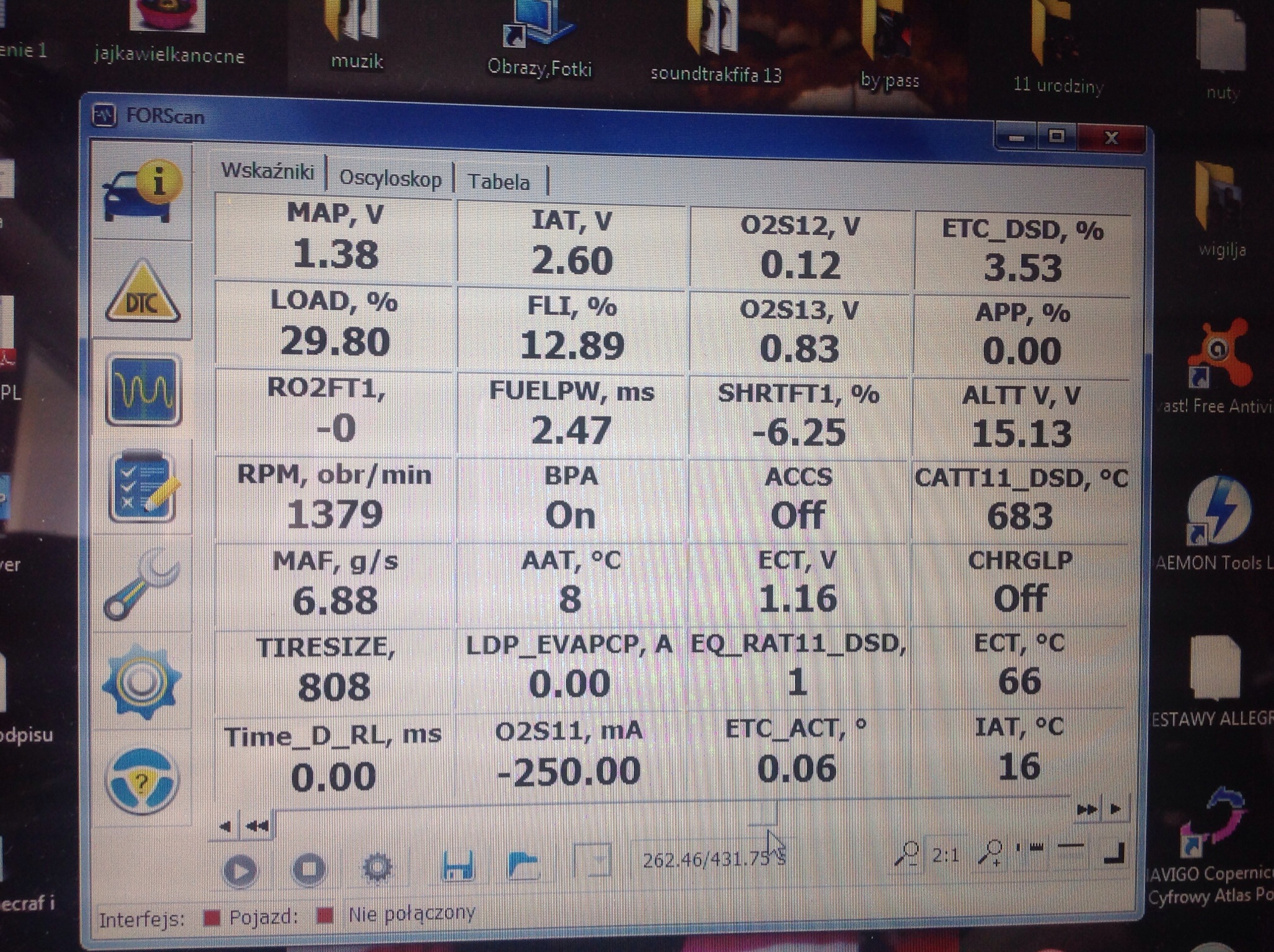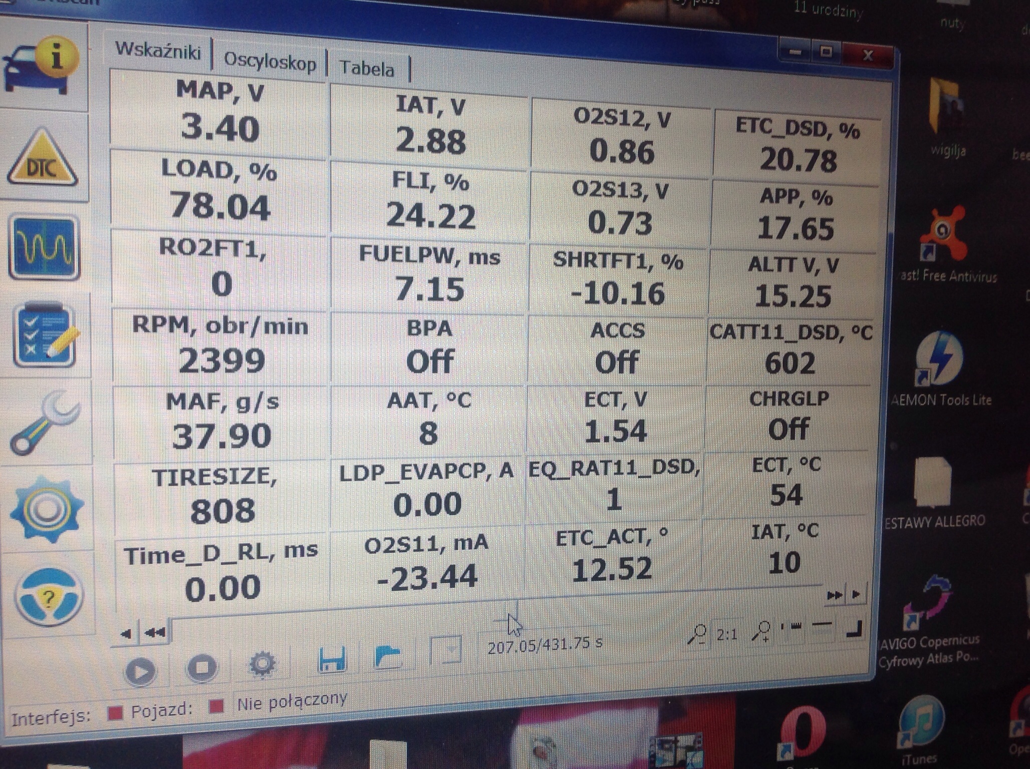 BARO, ECT, IAC, LOAD, LONGFT, MAF, RPM, SHRTFT, TPMODE, obciązenie alternatora, napięcie na alternatorze
