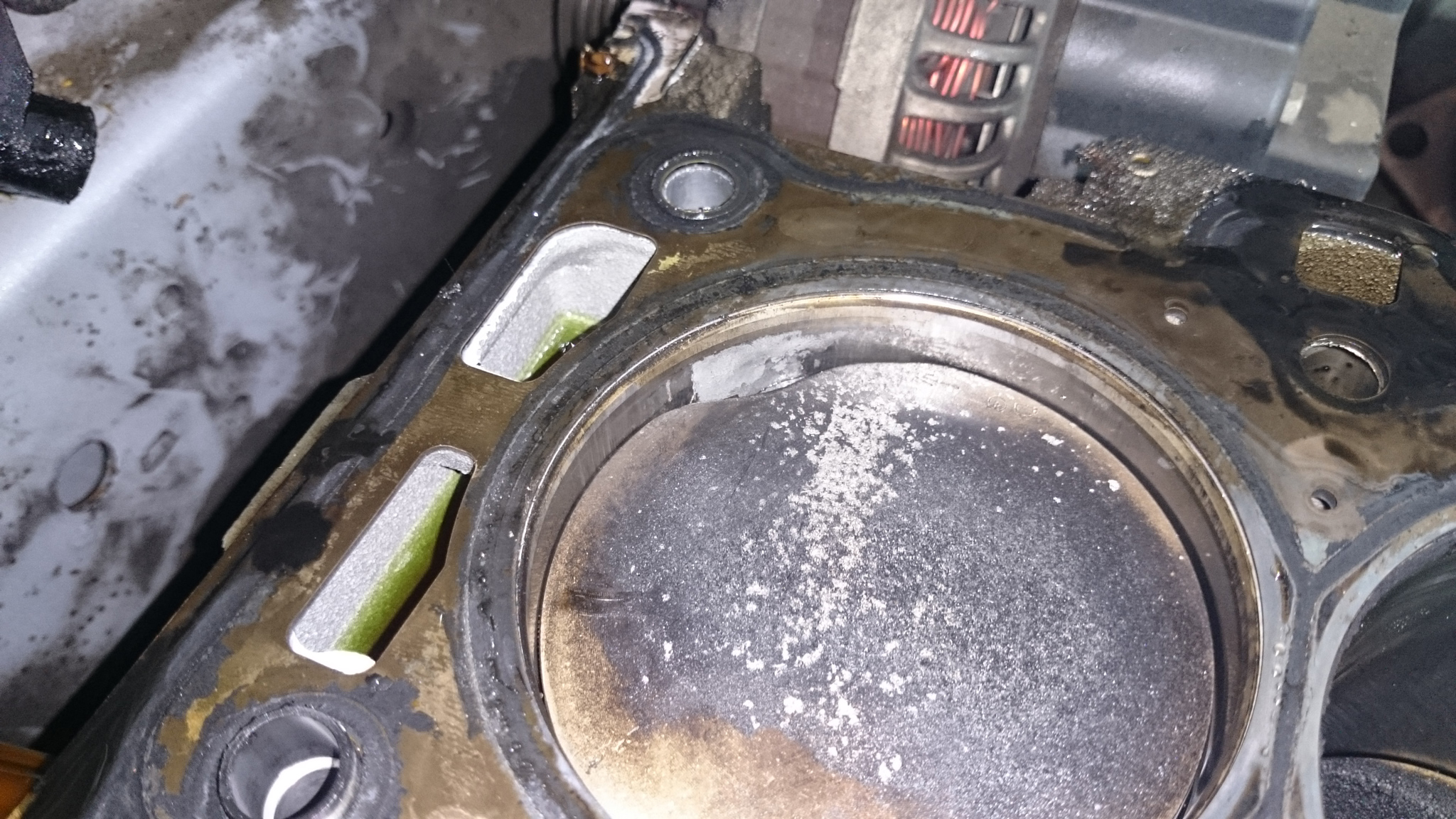 Startuję z remontem silnika i już pierwsze pytanie. Załączone zdjęcie przedstawia widok głowicy, na którym zaznaczyłem na zielono miejsca wkręcania świec, które normalnie powinny być suche (wolne od oleju) ale u mnie były wielokrotnie zalane olejem. I tu pytanie: Skąd ten olej?.