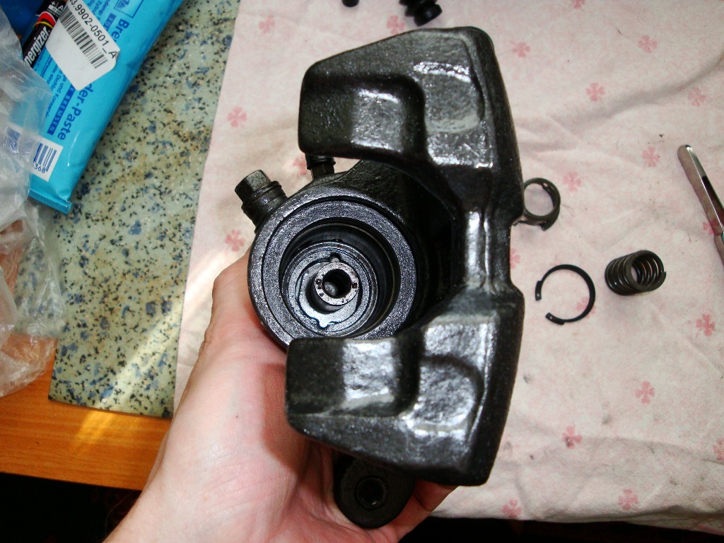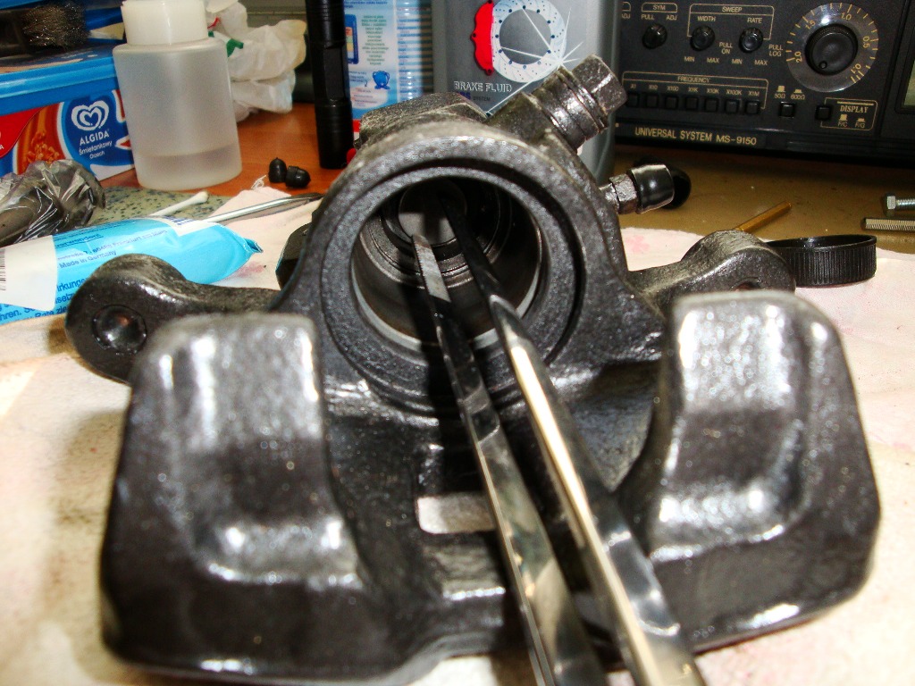 Od siebie mam dwie uwagi mianowicie, wypięcie zegara zwykłymi szczypcami nie sprawia większych problemów, natomiast jego wpięcie z powrotem w moim przypadku okazało się nie wykonalne. Problemem było doścignięcie go do dana tłoczka (standardowe szczypce są za grube) Dopiero zeszlifowanie szczypie (z oryginału została mniej więcej połowa) umożliwiło właściwie natychmiastowe załatwienie sprawy. Druga uwaga to pierścień stalowy przytrzymując gumową osłonę tłoczka jego rozmiar jest prawidłowy problem zakładki bierze się z tego że gumka układa się w nie właściwy sposób wewnątrz wyżłobienia. pierścień nie wchodzi w ostatni zwój gumki tylko na ten zwój i nie ma dość miejsca żeby właściwie się rozprężyć. Zauważyłem ze w tedy nie da się lekko przesuwać gumki na tłoczku.