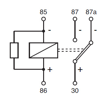 Drugi przekaźnik – zwierny – trzeba podpiąć również do układ z histerezą, tak aby został załączony, gdy napięcie spadnie poniżej około 13V, a na wyjście 87 kabel 3 (niebieski w czarne paski). W ten sposób zostaną otwarte zamki, gdy silnik zgaśnie, nawet jeśli kluczyk będzie dalej w pozycji ON.