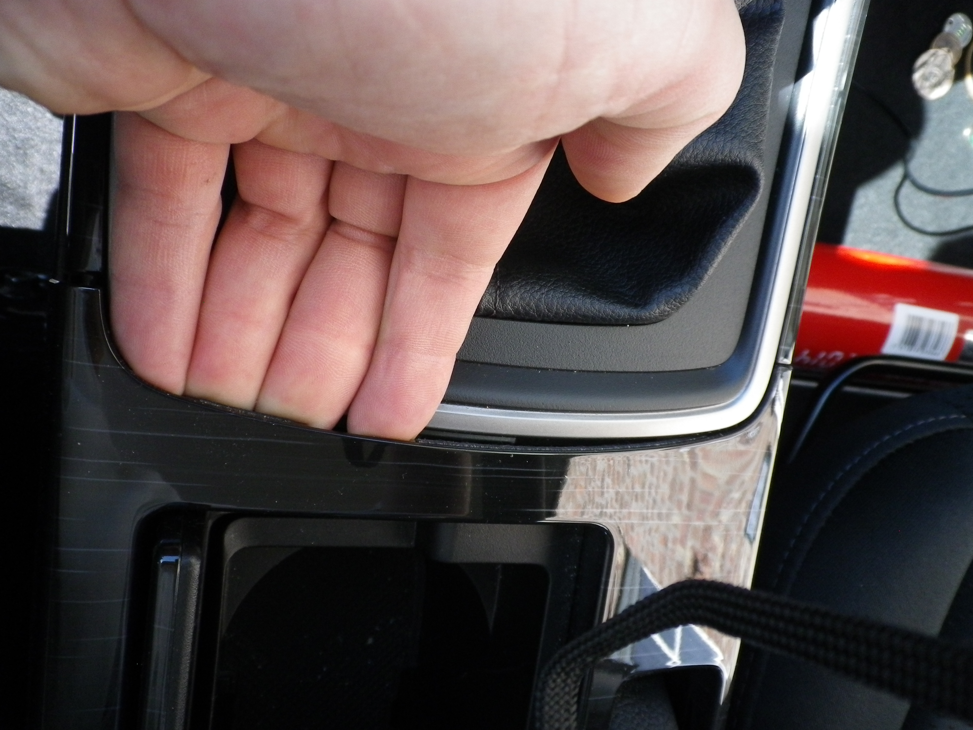Otwieramy pojemnik na kubki i delikatnie chwytamy palcami z tyłu klapki. Podciągamy delikatnie do góry, nie za mocno, jak puszcza zatrzaski przechodzimy dalej dookoła obudowy.