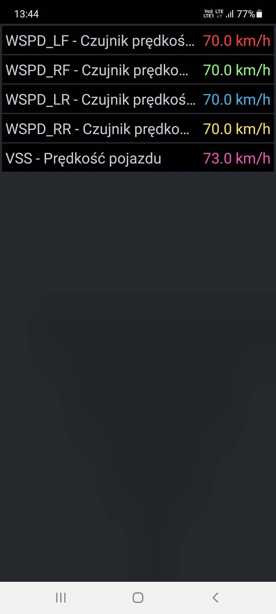 Forscan pokazuje jednakową predkość na wszystkich kołach.