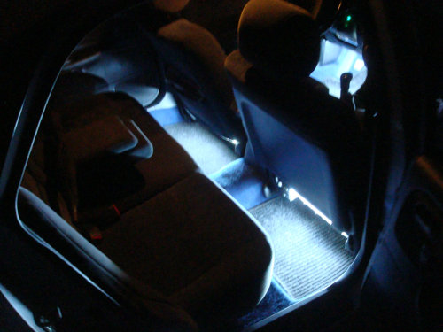 Wykonałem u siebie takie podświetlanie, podpinając się do lampki sufitowej (przez słupek lewy). Użyłem 1 metr taśmy SMD-300 (3 diody na 5cm) z diodami 3528, kolor pomarańczowy-bursztynowy, w żelowym silikacie (IP65 – nie tyle dla wodoodpornosci, co ze względu na bardziej rozproszone światło). Wyszło bardzo fajnie – kolor "Ice Tea" ładnie komponuje się z oryginalnymi dywanikami welurowymi.