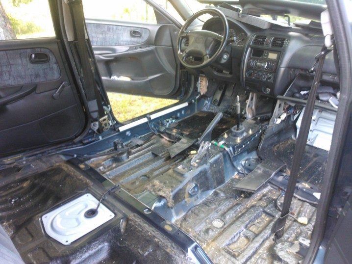 . Dlatego też do jej demontażu niezbędne jest wyjęcie całej tapicerki. Niezbędne jest komplet płaskich kluczy, torxów oraz śrubokręt krzyżakowy. Najlepiej zacząć od demontażu plastików na progach oraz osłony środkowego słupka. Potem do wykręcenia fotele tylne (tutaj przydadzą się torxy), fotele przednie (wcześniej należy wypiąć z nich kostki). Następnie należy zdemontować konsolę środkową, która trzyma się na 6 śrubach. Gałkę zmiany biegów wystarczy normalnie odkręcić. Teraz wystarczy zdemontować tapicerkę podłogi, która trzyma się na kilku spinkach. Po demontażu podłoga będzie wyglądała mniej więcej tak: