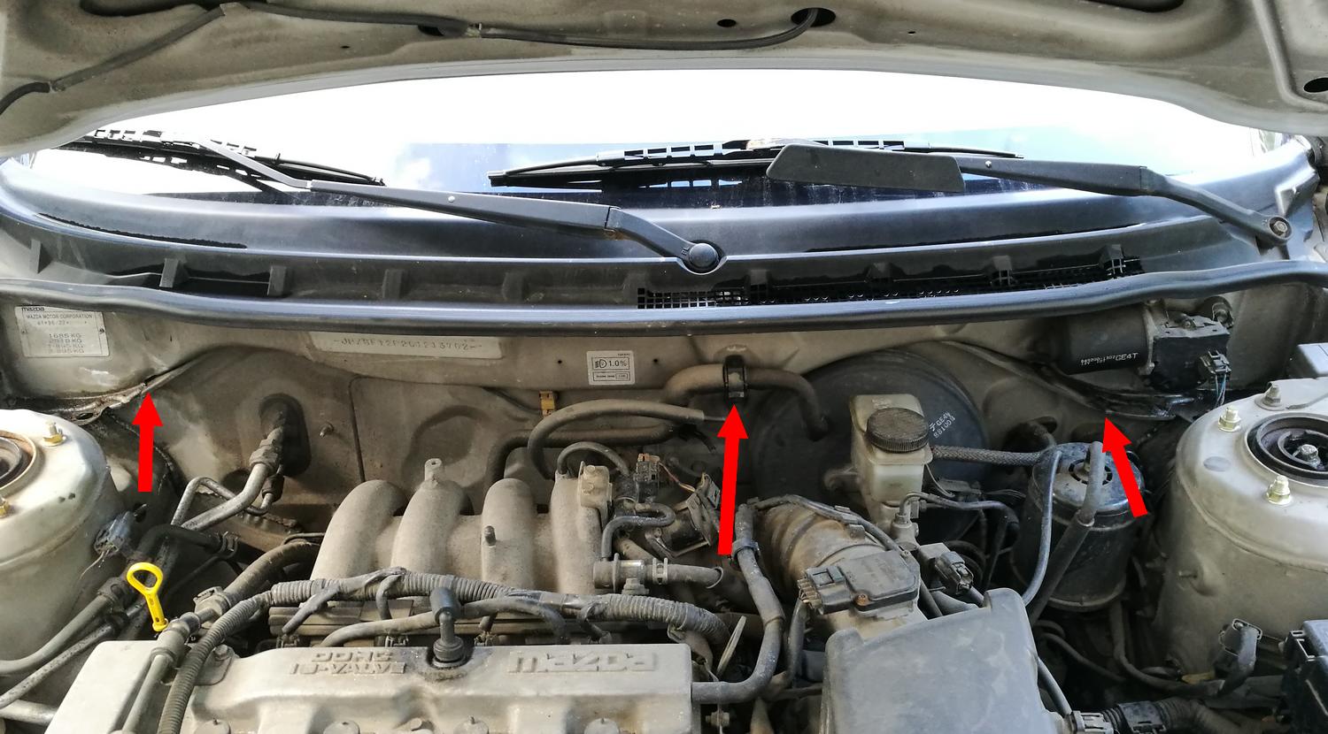 Mam problem, od pewnego czasu zdarze się, że mam potop w samochodzie – nasiąknięte dywaniki woda, i to całkiem solidnie. Naczytałem się, że głównym sprawcą mogą być niedrożne odpływy wody w podszybia. Dzisiaj podniosłem maskę, polałem podszybie litrem wody, woda pięknie leci trzema "otworami" na połączeniu blach w komorze silnika (zaznaczone czerwonymi strzałkami). Czy tak być powinno? Jakieś sugestie, skąd ta woda może pochodzić? Nie ma reguły, czasem po dużym deszczu jest sucho, a czasem po "przewlekłym" (np. topniejący śnieg, jest bardzo mokro.