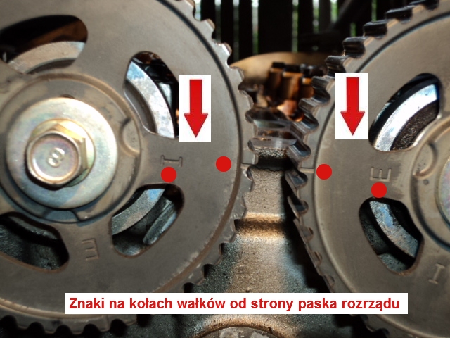 11. Ustawiamy rozrząd na znaki(na kółkach w głowicy I i E powinno sie pokrywać znak na wale powinien pokrywać się ze znakiem na bloku)