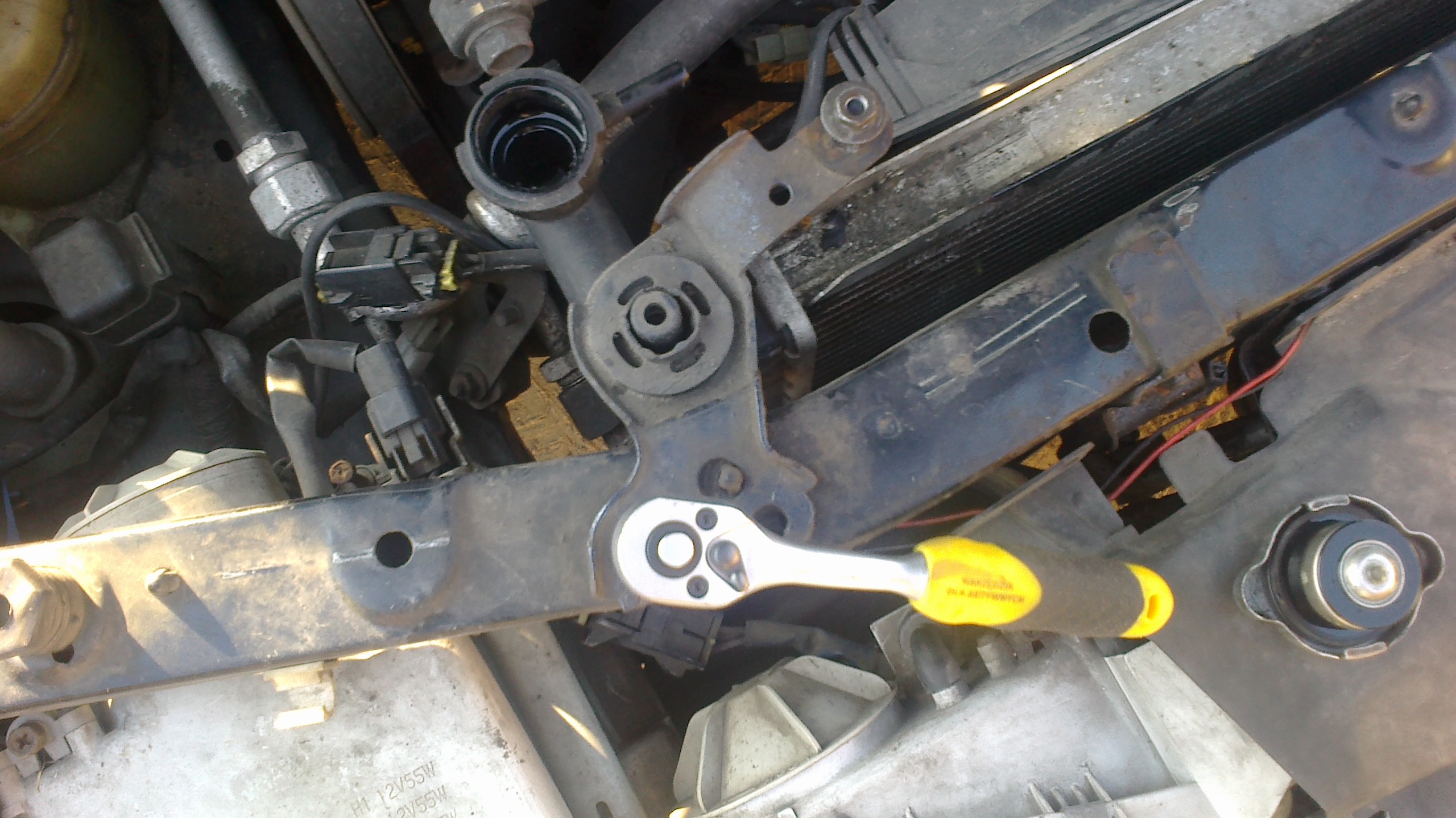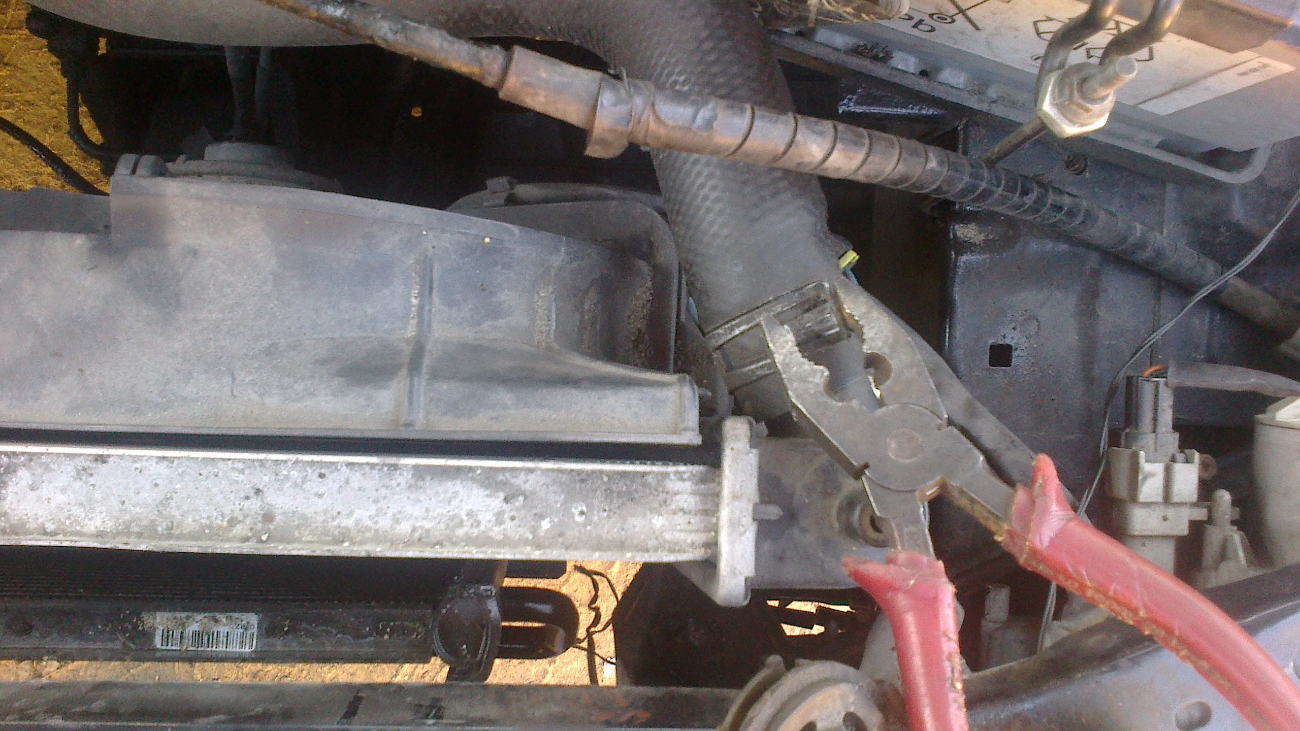 2. Płyn sobie leci, a w tym czasie zaczynamy odkręcać wlot powietrza kluczem 10 oraz uchwyty trzymające chłodnicę i owy wlot kluczem 13. Wtyczki wentylatorów ( u mnie dwa) oraz rurkę od zbiorniczka wyrównawczego