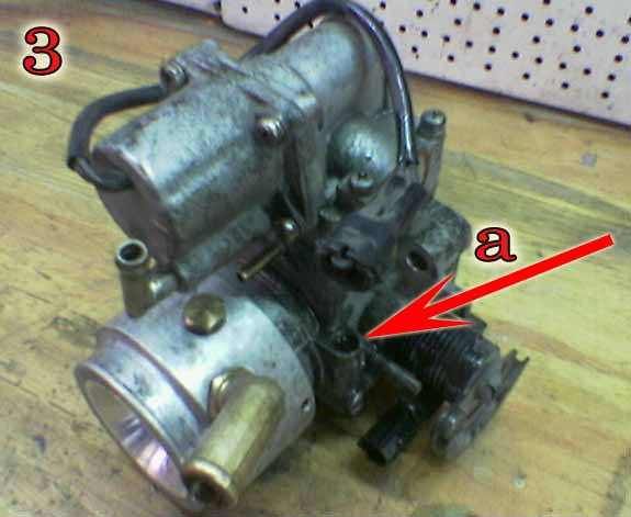 – Fot 3. Przepustnica wraz z mikserem LPG. Śruba bypass'u (a) żeby go przeczyścić należy wykręcić tę śrubę (najlepiej zapamiętać położenie i ilość wykręcanych obrotów -u mnie 17).