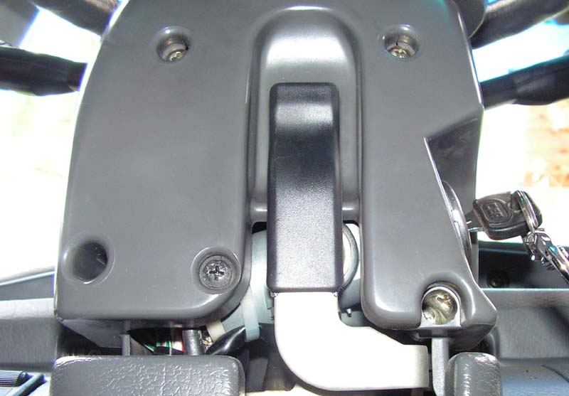 Jak już uporamy się z plastikami zabieramy się za odkręcenie przełącznika zespolonego od drążka kierownicy. Trzyma sie na jednej śrubie, która ściska opaskę (z lewej strony kierownicy obok stacyjki). Nie odkręcamy jej całkowicie tylko poluzowujemy.