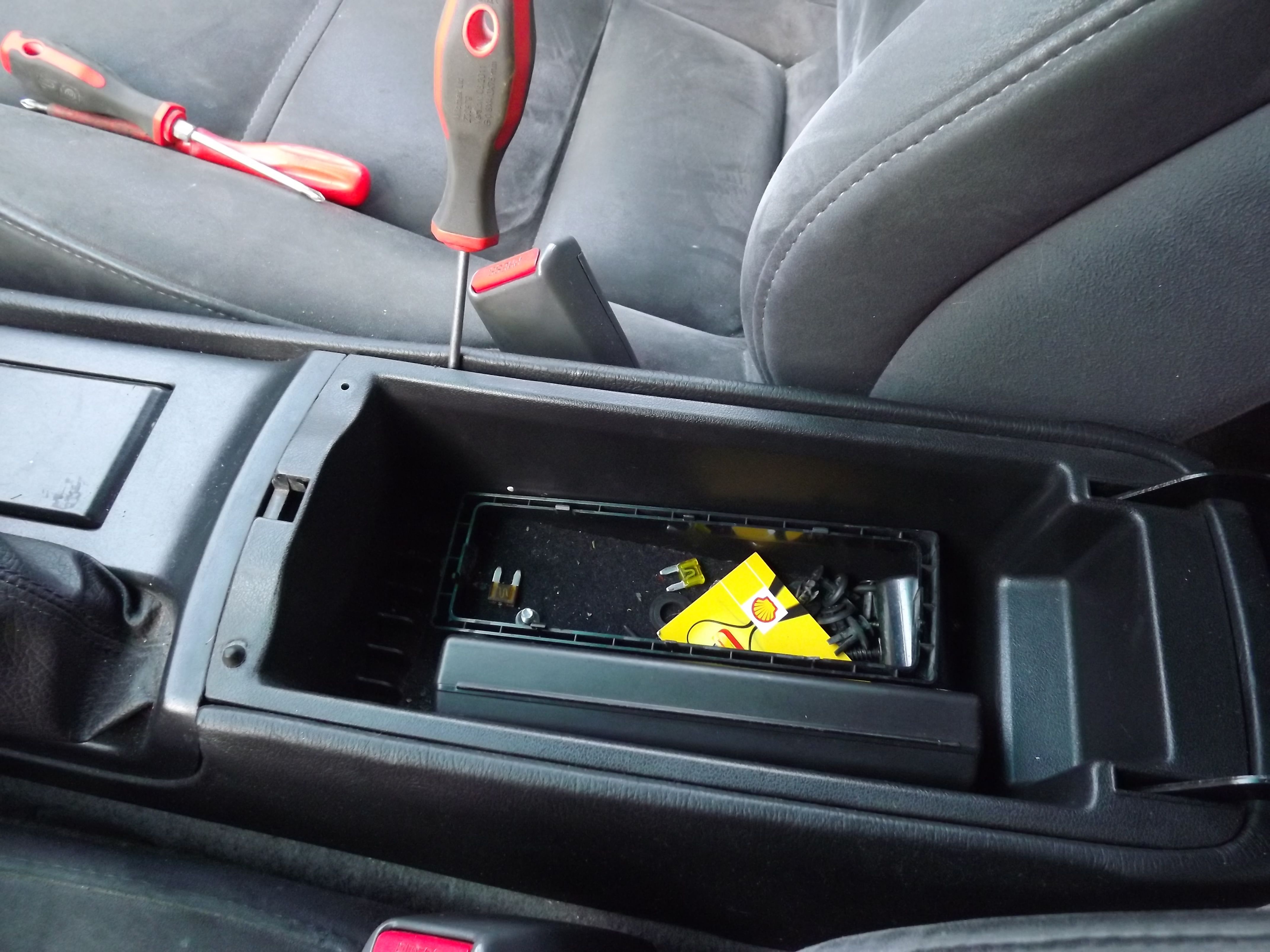 Więc od początku, otwieramy podłokietnik i wyciągamy z niego wszystko aby było łatwiej, i podważamy kuwetkę/pojemnik płaskim śrubokrętem tak aby nam wyszła.