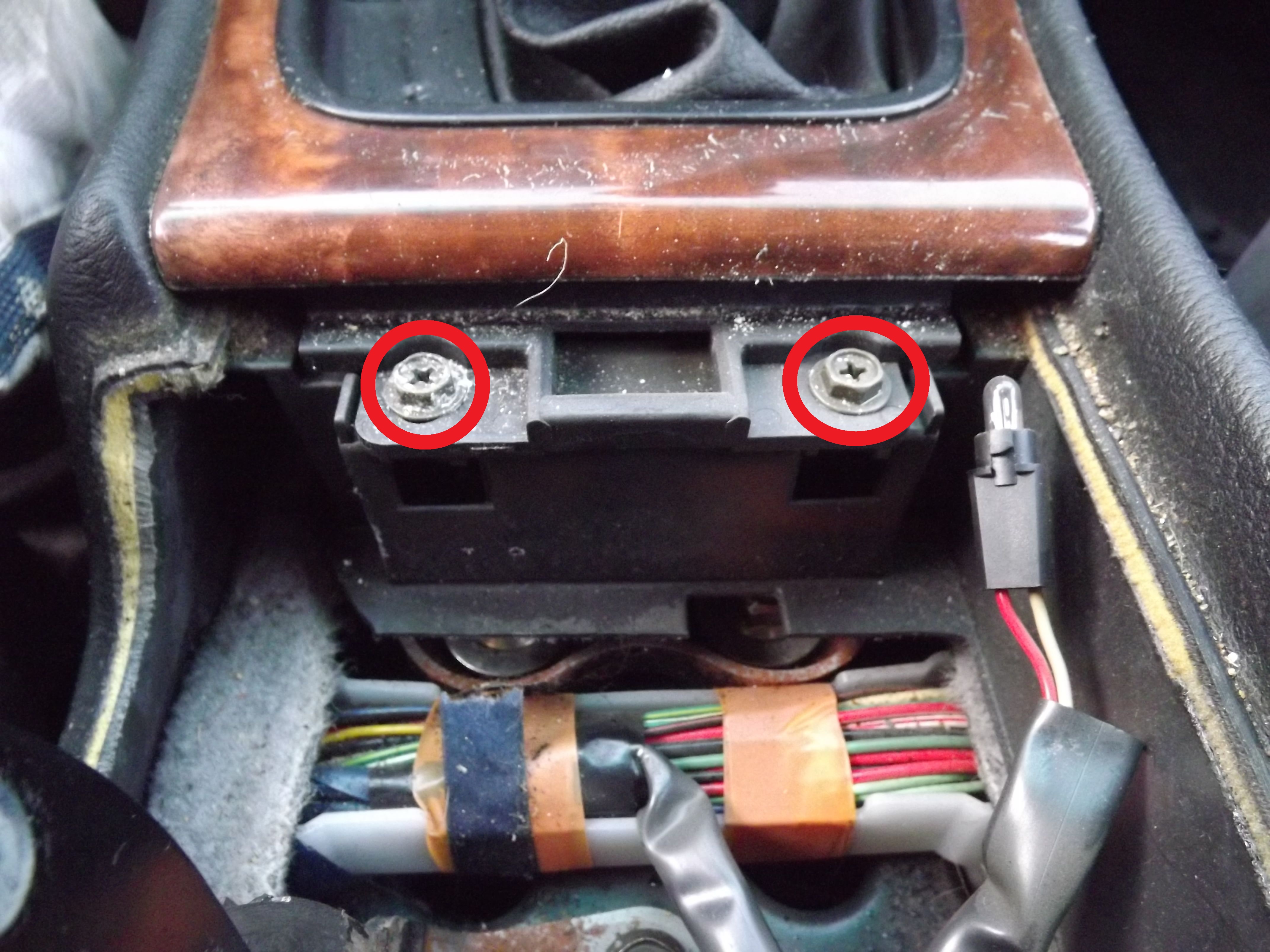 Jeżeli ktoś chce demontować cały tunel środkowy będzie musiał odkręcić zaznaczone na czerwono śrubki, czyli 2x klucz 10 oraz 2x krzyżak.