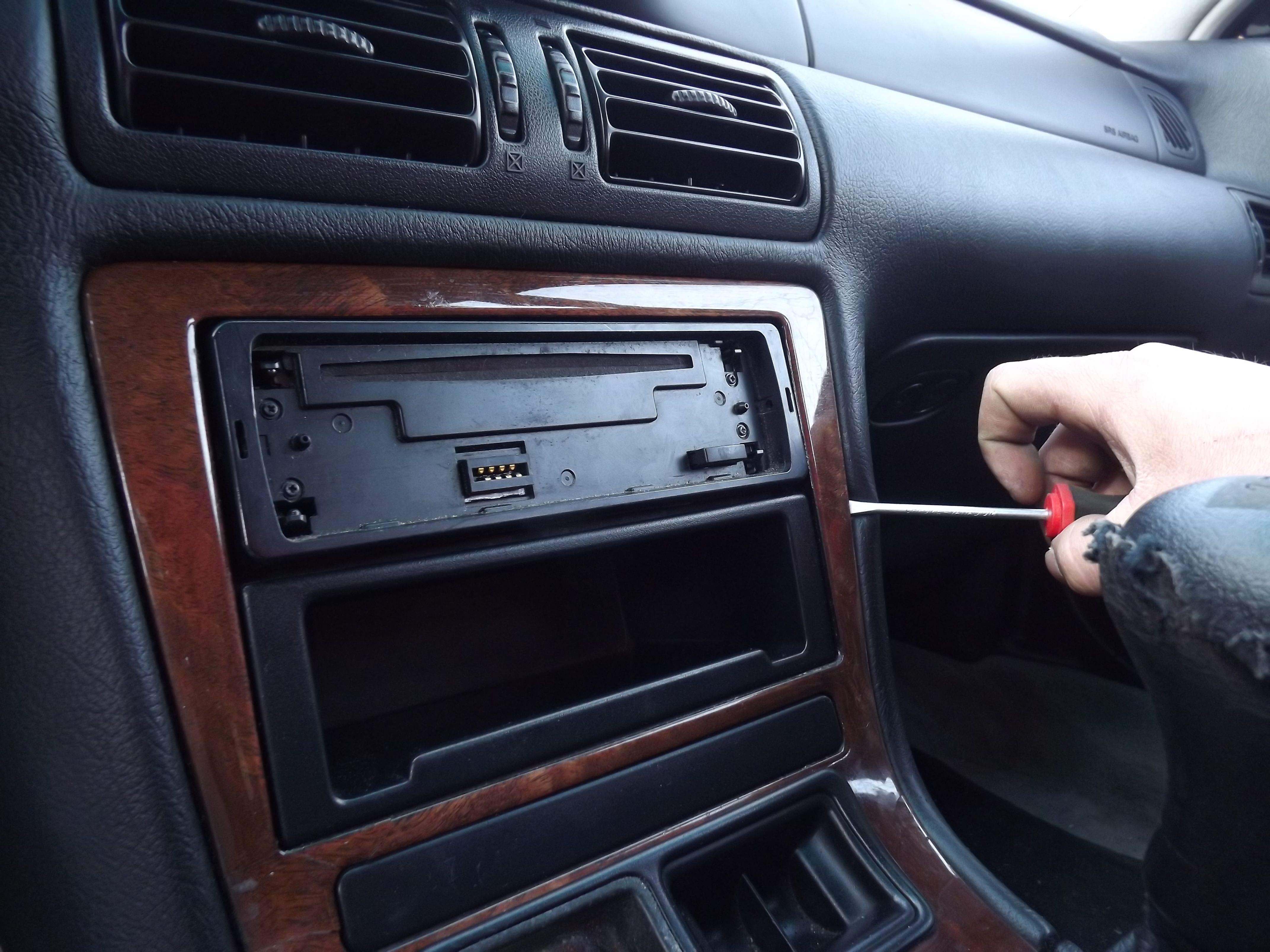 Po odkręceniu śrubek przystępujemy do ściągnięcia drewienka, tu z pomocą przyjdzie nam płaski śrubokręt, delikatnie podważamy na rogach i tak oto drewienko uwalnia się z zatrzasków, może być konieczność wyciągnięcia radia aby nic nie oberwać.