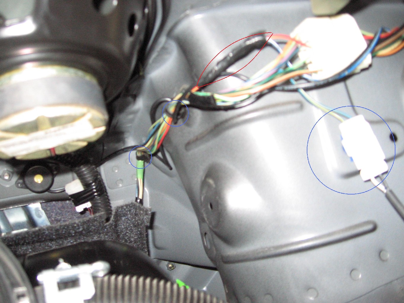 - przewód zasilający czyli ten powyżej opisany oraz przewód od buzzera przeprowadziłem wraz z oryginalną wiązką widoczną na zdjęciu