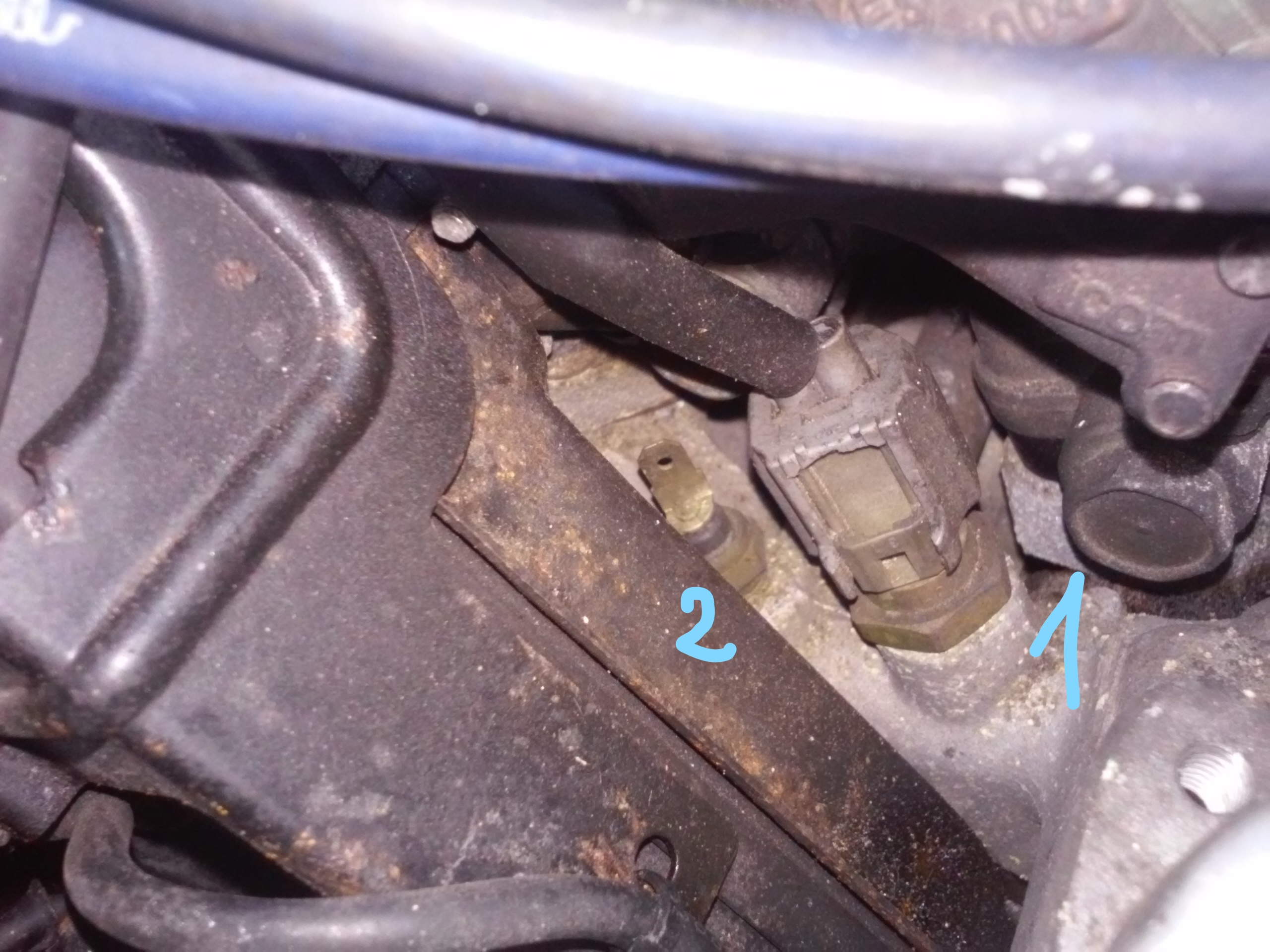 Odnalazłem w swojej X9 nie podpięty czujnik. Nr 2 na zdjęciu. Jest to czujnik temperatury cieczy jak mniemam. Tylko, że jest on odpięty od przewodu a ja na blacie elegancko mam wskazania temperatury. O co chodzi? Czujnik nr 1 steruje załączeniem wentylatora, czy tak? Czy to może z niego leci sygnał na zegar?