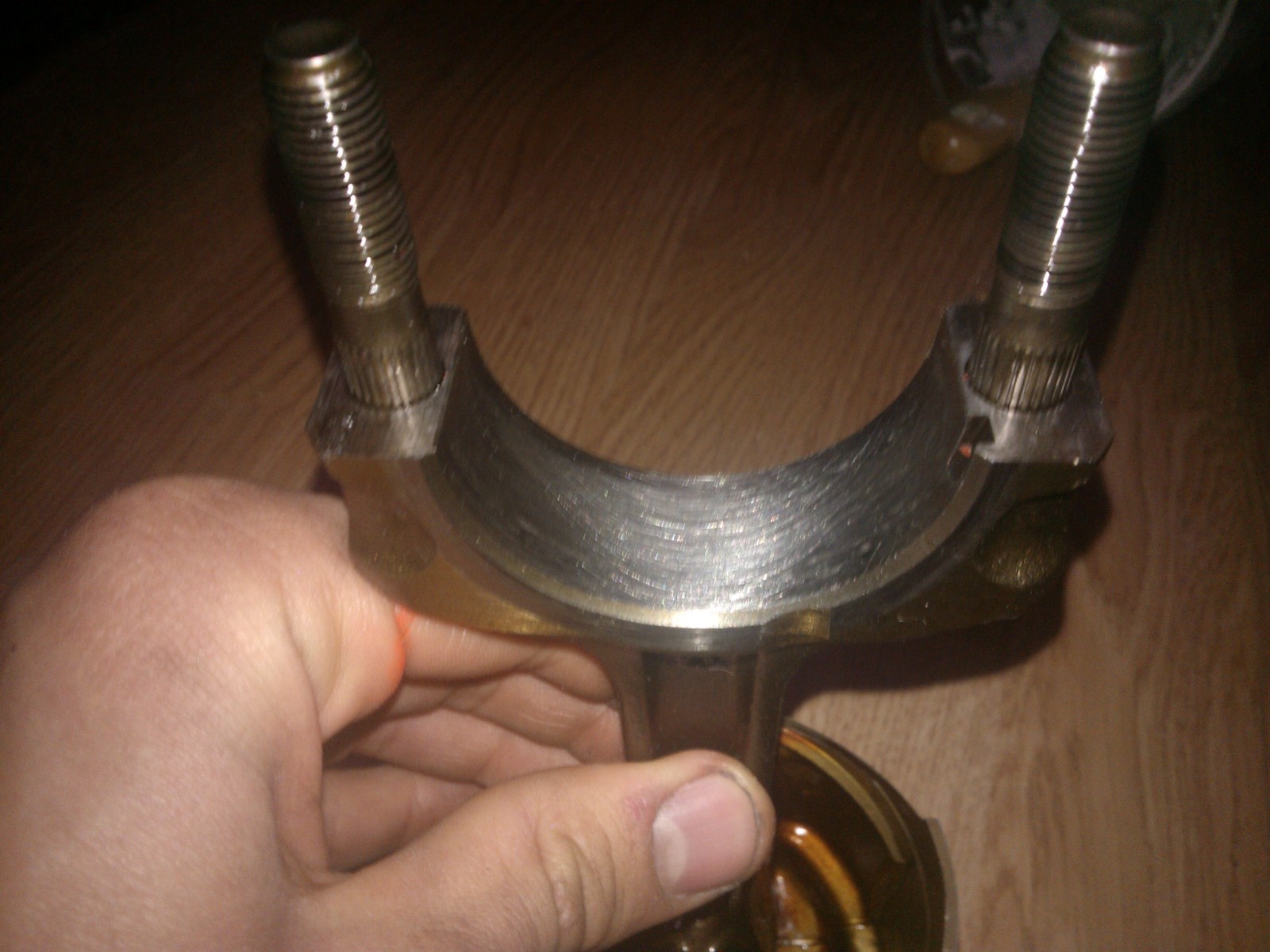 Dziwnie to wygląda. Ktoś szlifował korbowód po obróconej panewce? Próbował założyć złą panewkę? Jak wygląda czop wału?